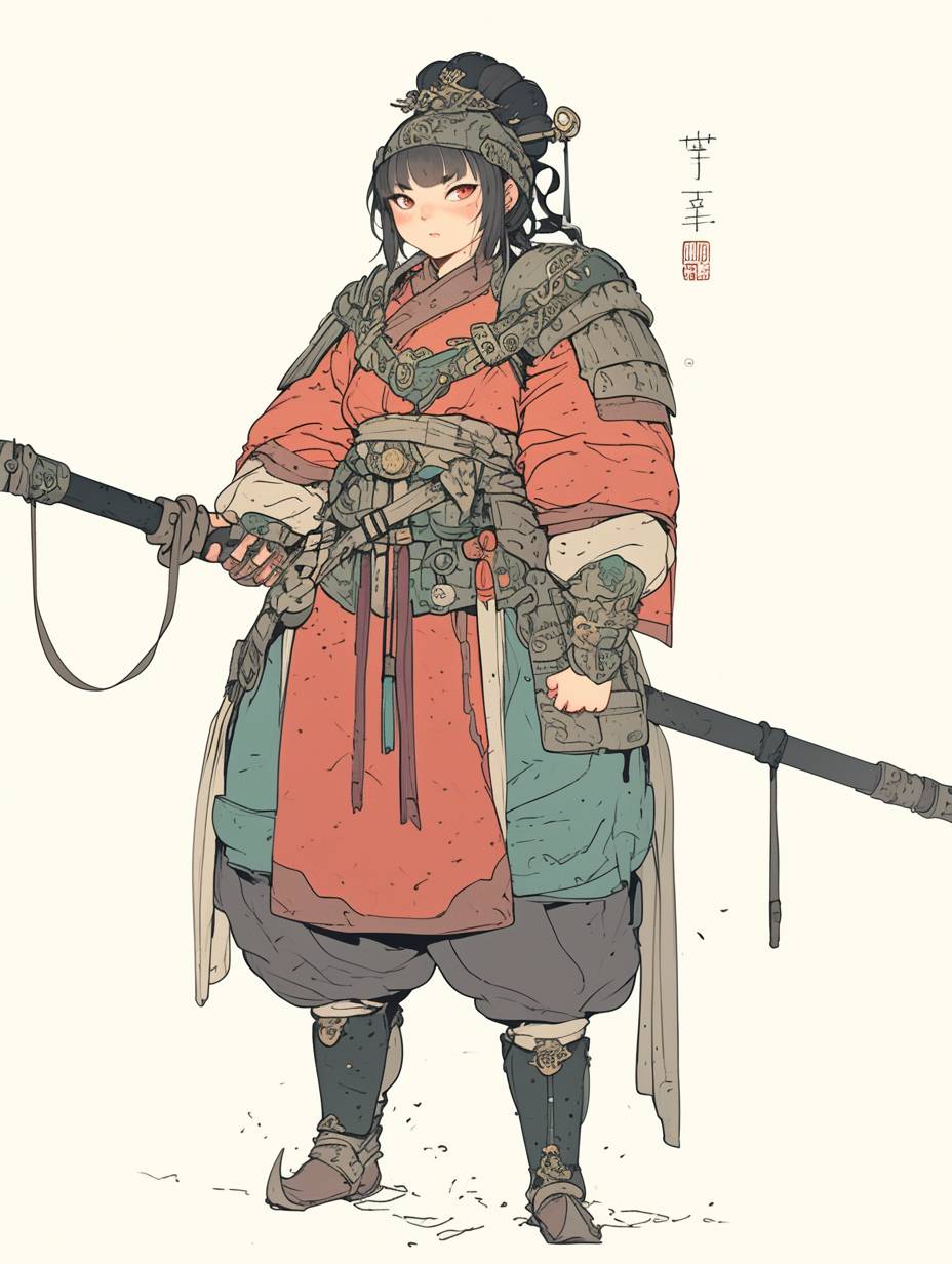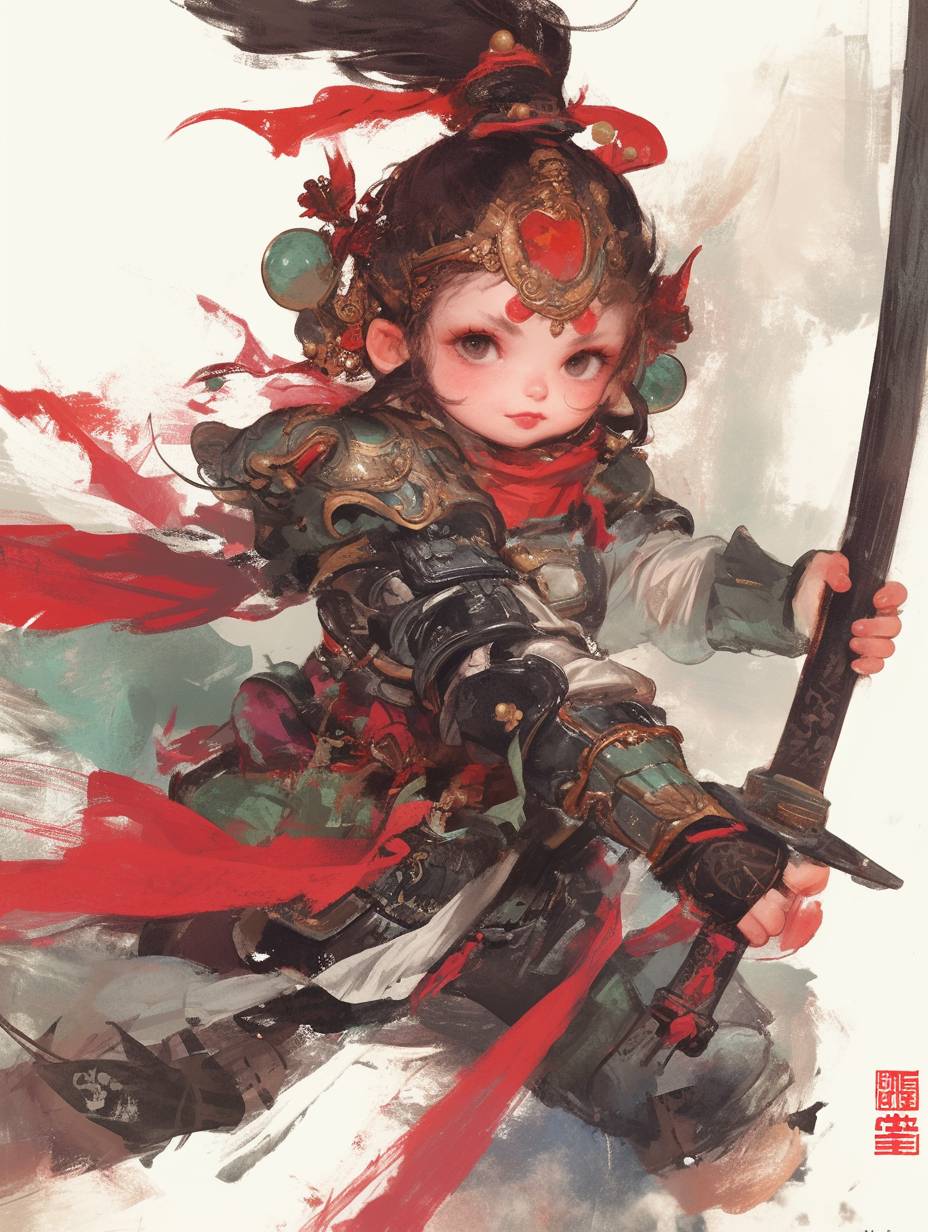 Tang Dynasty Little Girl,ancient Chinese cute cartoon soldier image, fat style, Chinese ink light color, velvet brush strokes, light red and black, dotted with green, gesture marks, exaggerated comic expression, ultra-detailed details, minimalism --ar 3:4 --niji 6