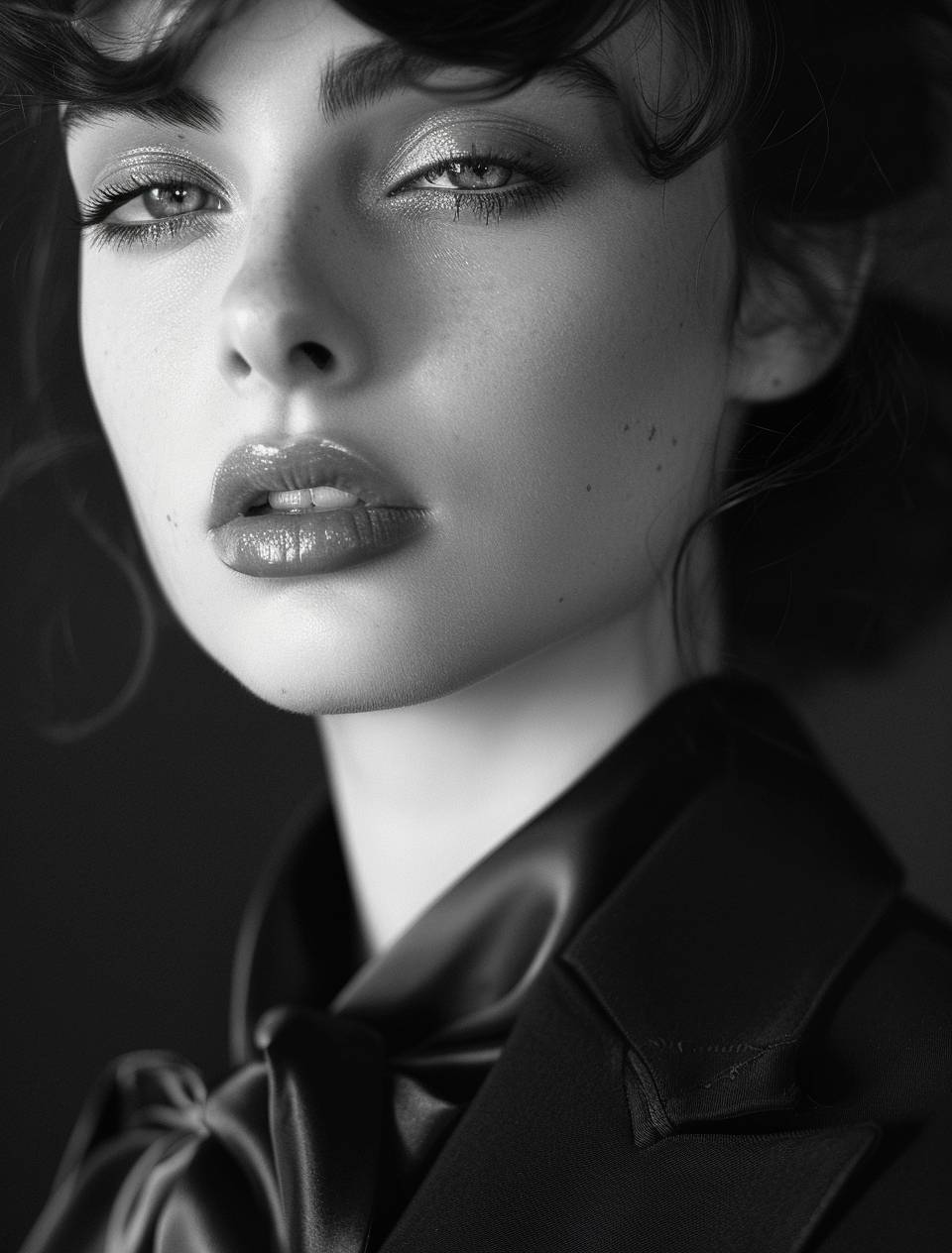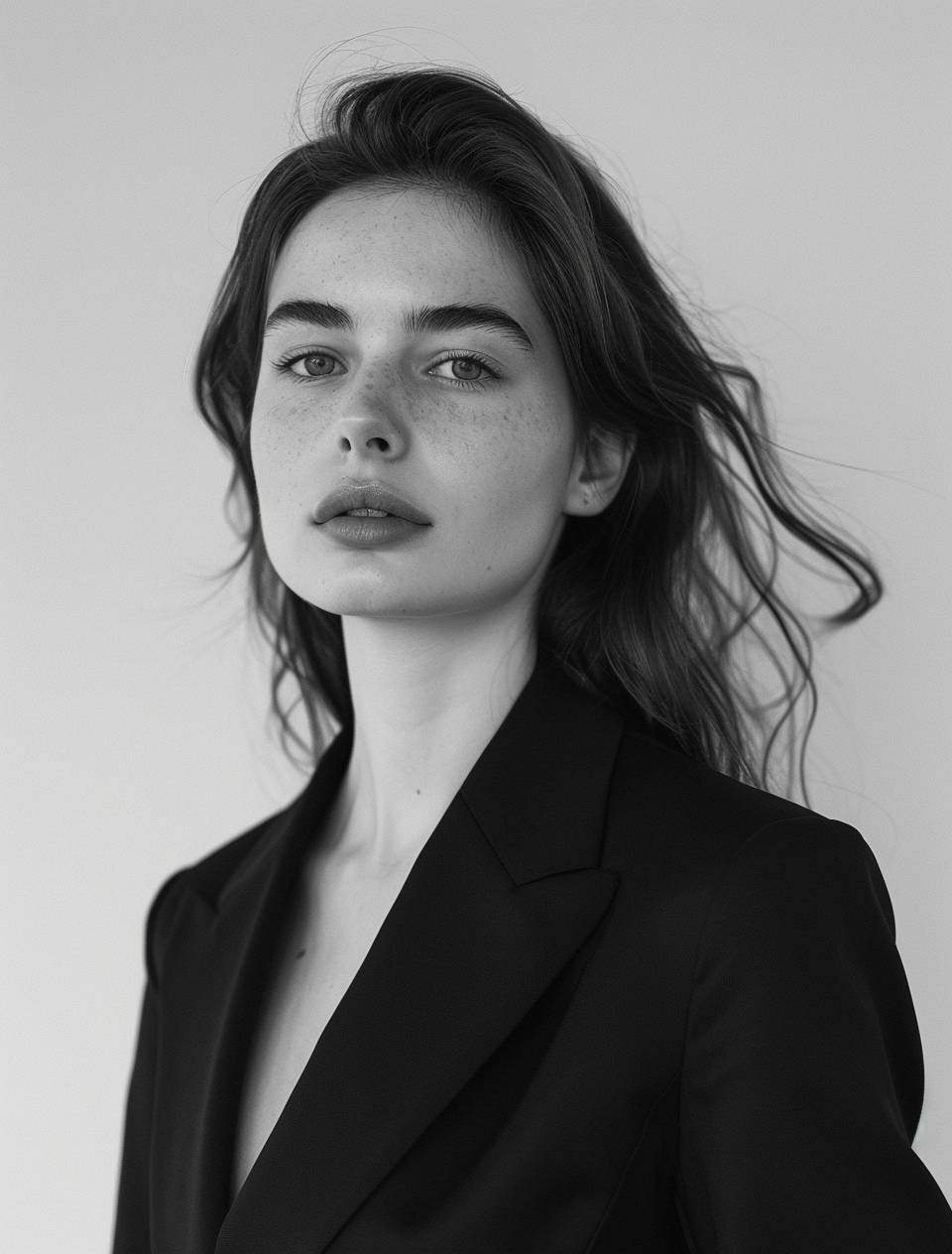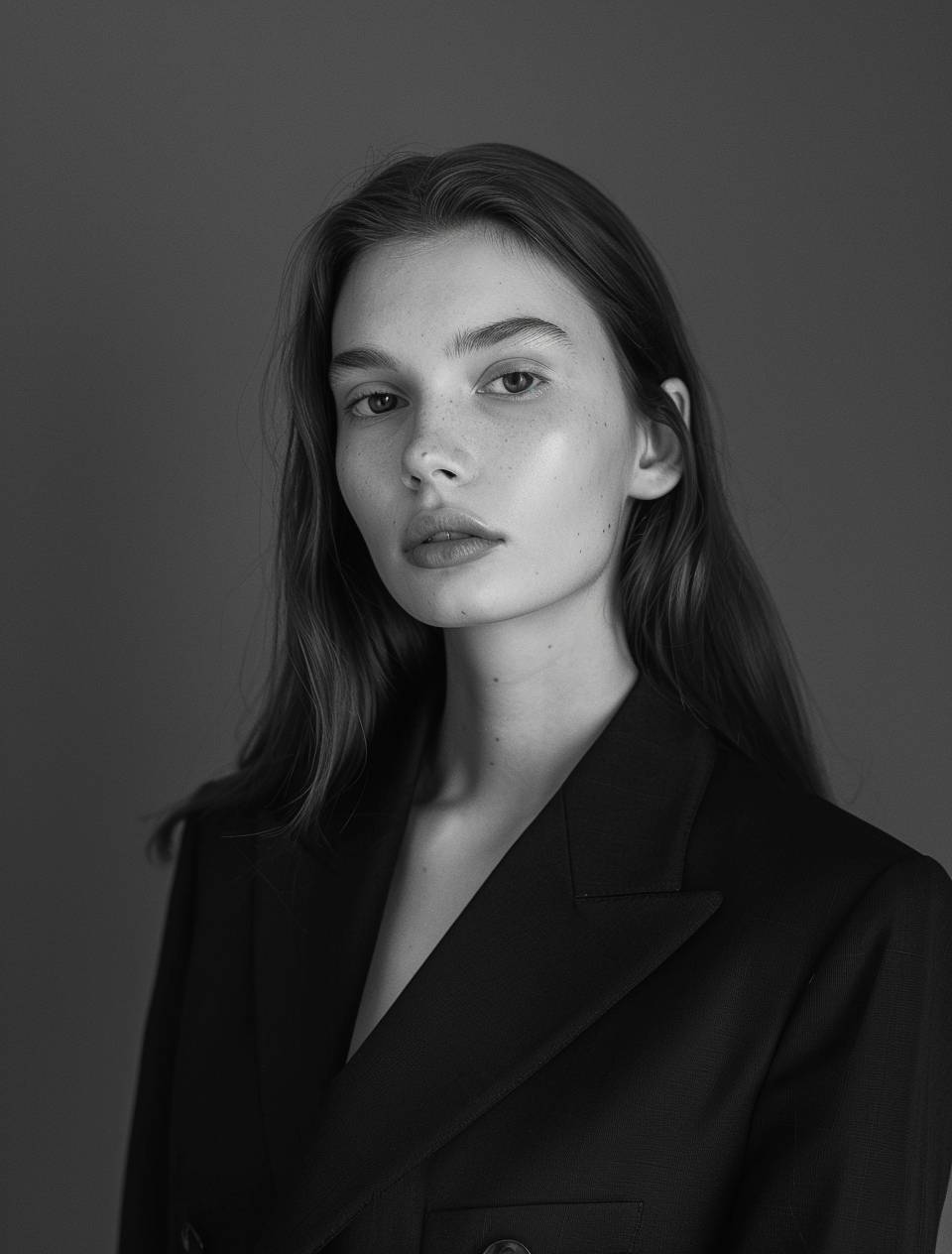 一位年輕女性的頭像,身穿黑色西裝,以經典黑白攝影風格捕捉,柔和的攝影棚燈光強調了她精緻的面部特徵。這幅肖像通過柔和的陰影運用來定義,創造了光線的交互,精緻地勾勒出她的面龐,突顯了她的表情和西裝的剪裁線條。單色調的選擇增強了圖像的高雅和永恆氣息,聚焦於柔和燈光技術所帶來的深度和細微差別。這種設置完美地傳達了傳統人像攝影的細膩優雅和端莊氛圍。