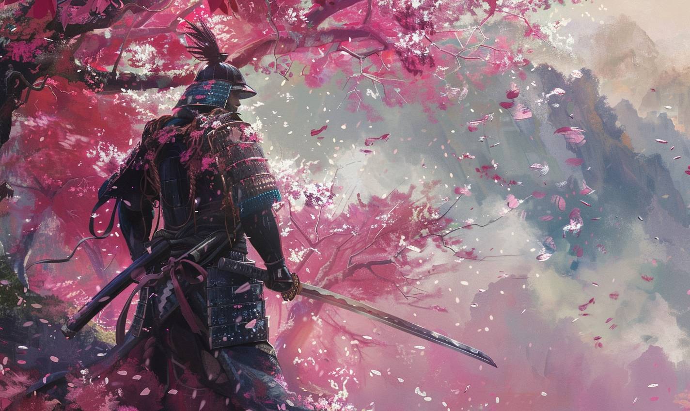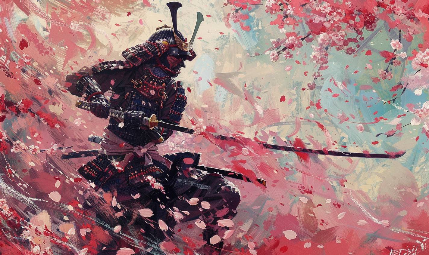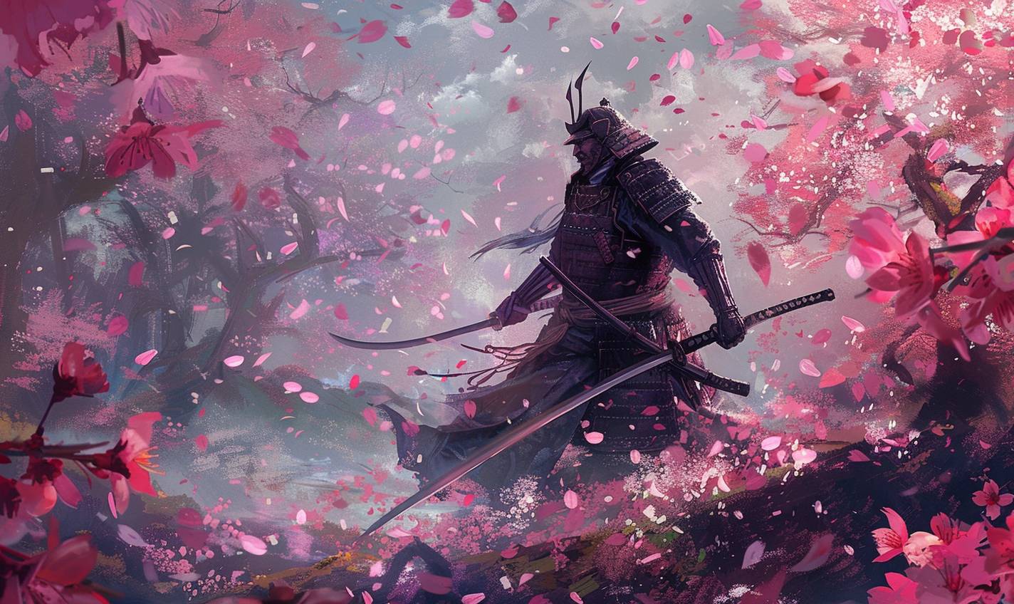in style of Krenz Cushart,Samurai warrior in a cherry blossom garden --ar 5:3 --v 6.0