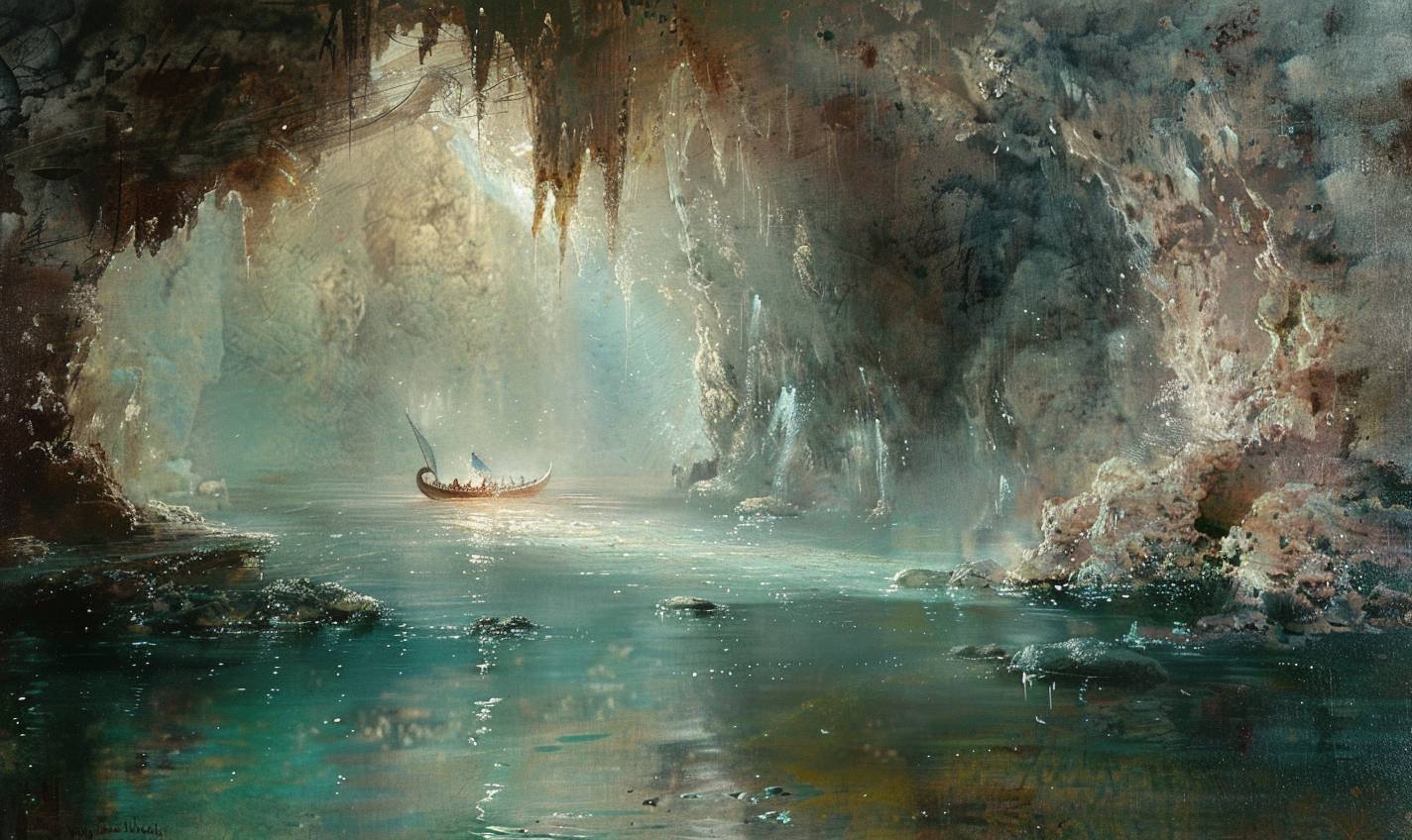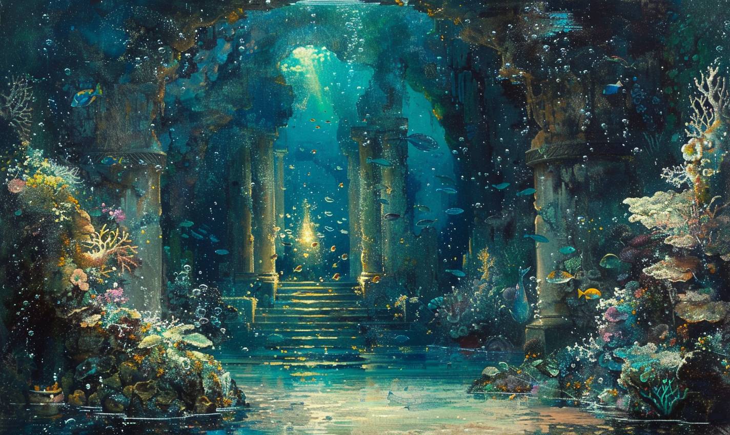 in style of Eugene Galien-Laloue,Underwater grotto with shimmering mermaids --ar 5:3 --v 6.0