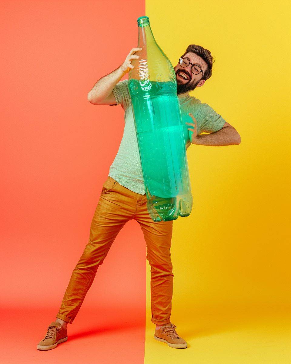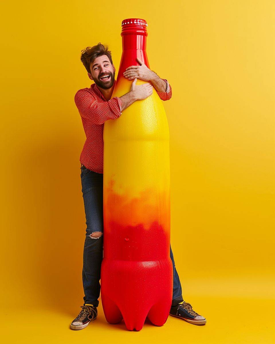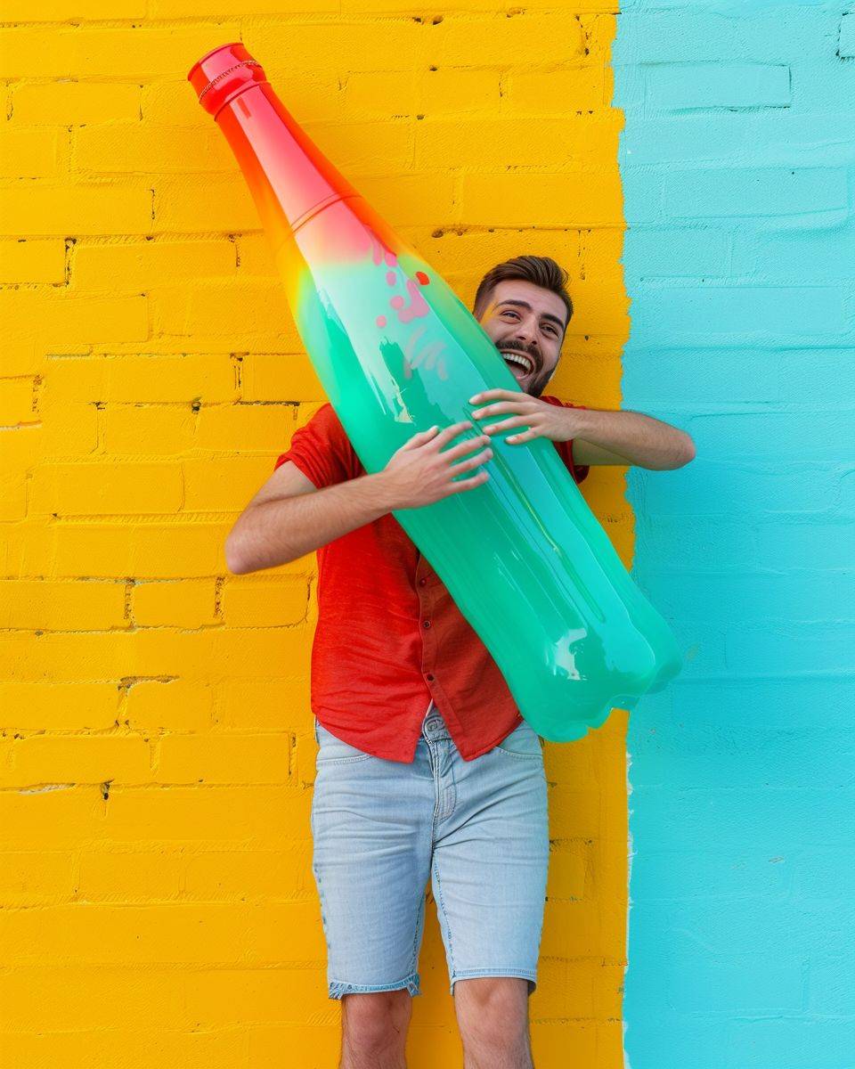 一個男人在興奮的動作姿勢中,擁抱著一個比他還大的冷飲瓶,背景色彩鮮艷,黃、紅、薄荷色的戲劇性低角度拍攝。