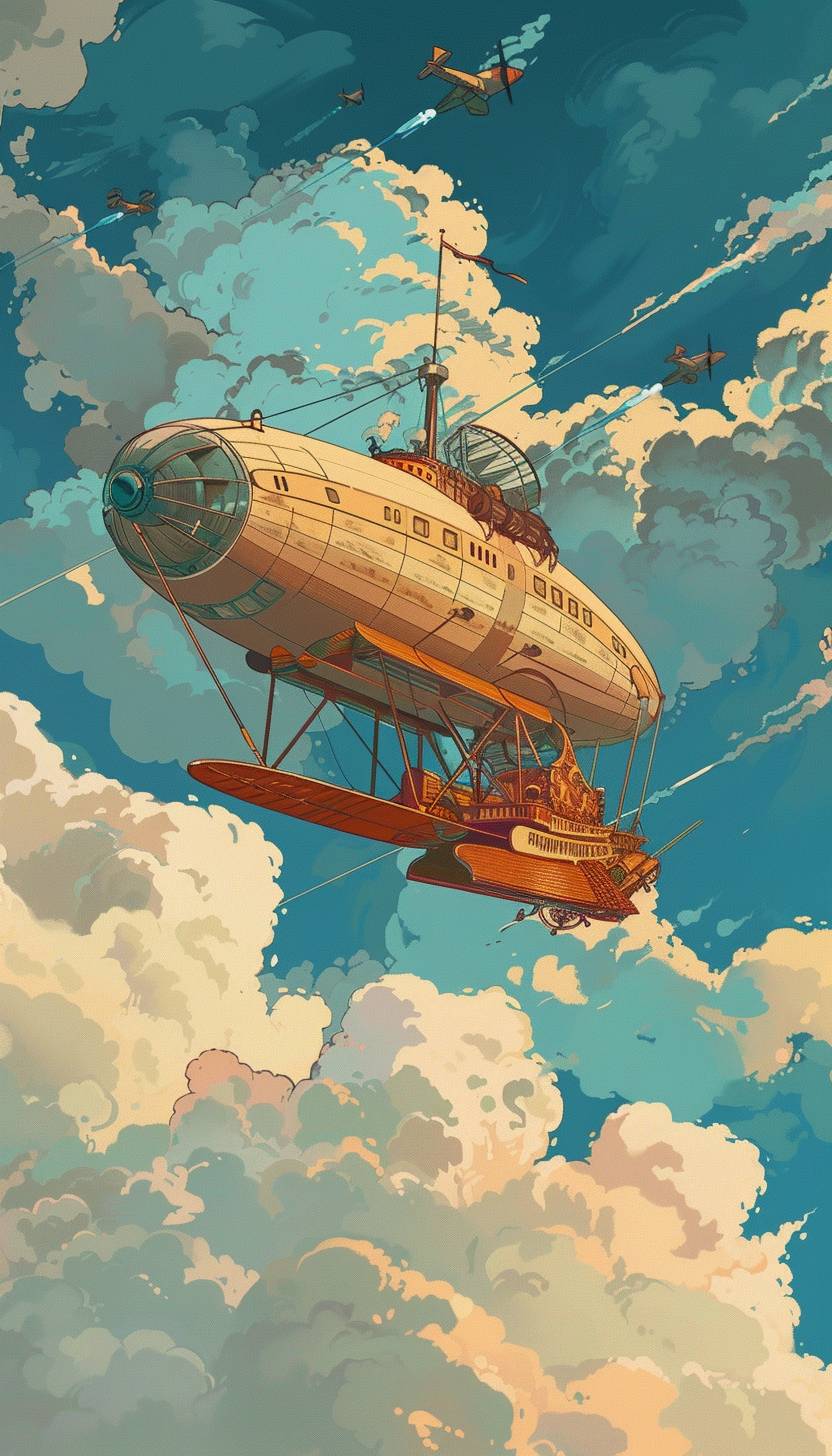 in style of Cliff Chiang,Steam-powered airship soaring through clouds --ar 4:7 --v 6.0