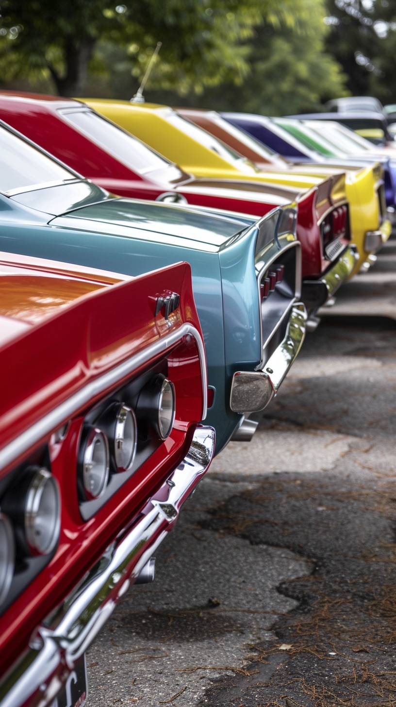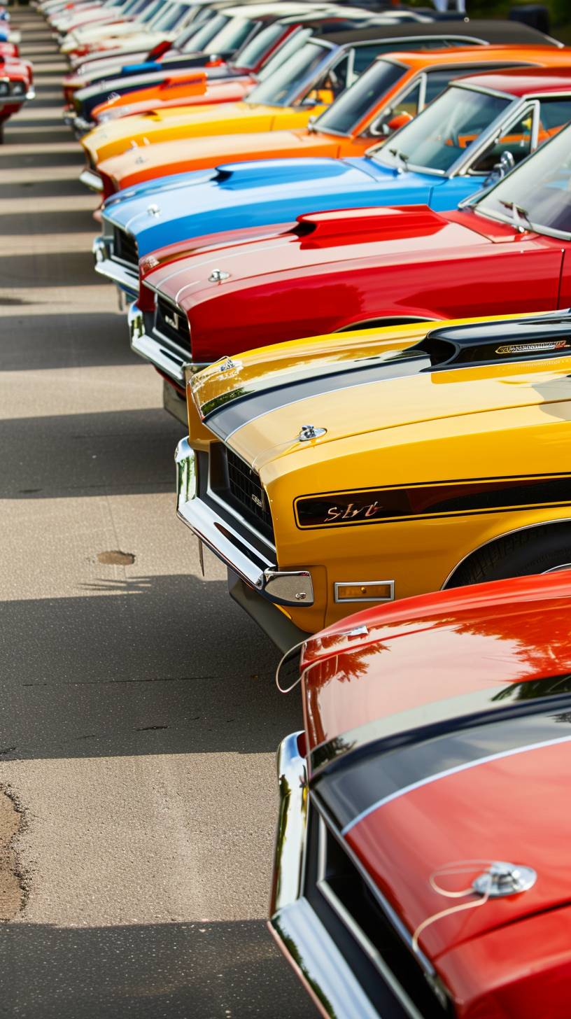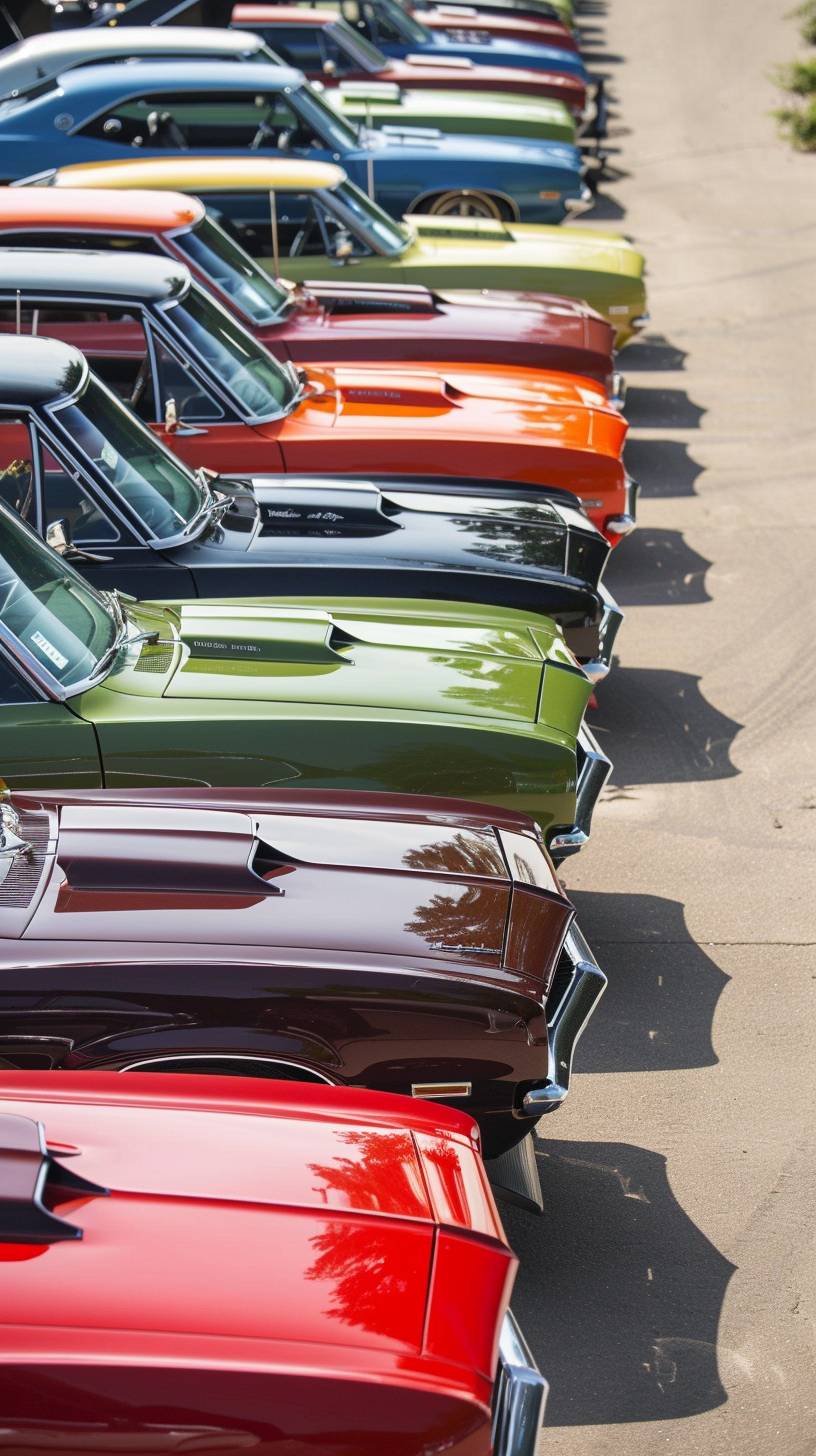 a long row of 1960's and 1970's muscle cars of all different types and designs and colors --ar 9:16 --v 6.0