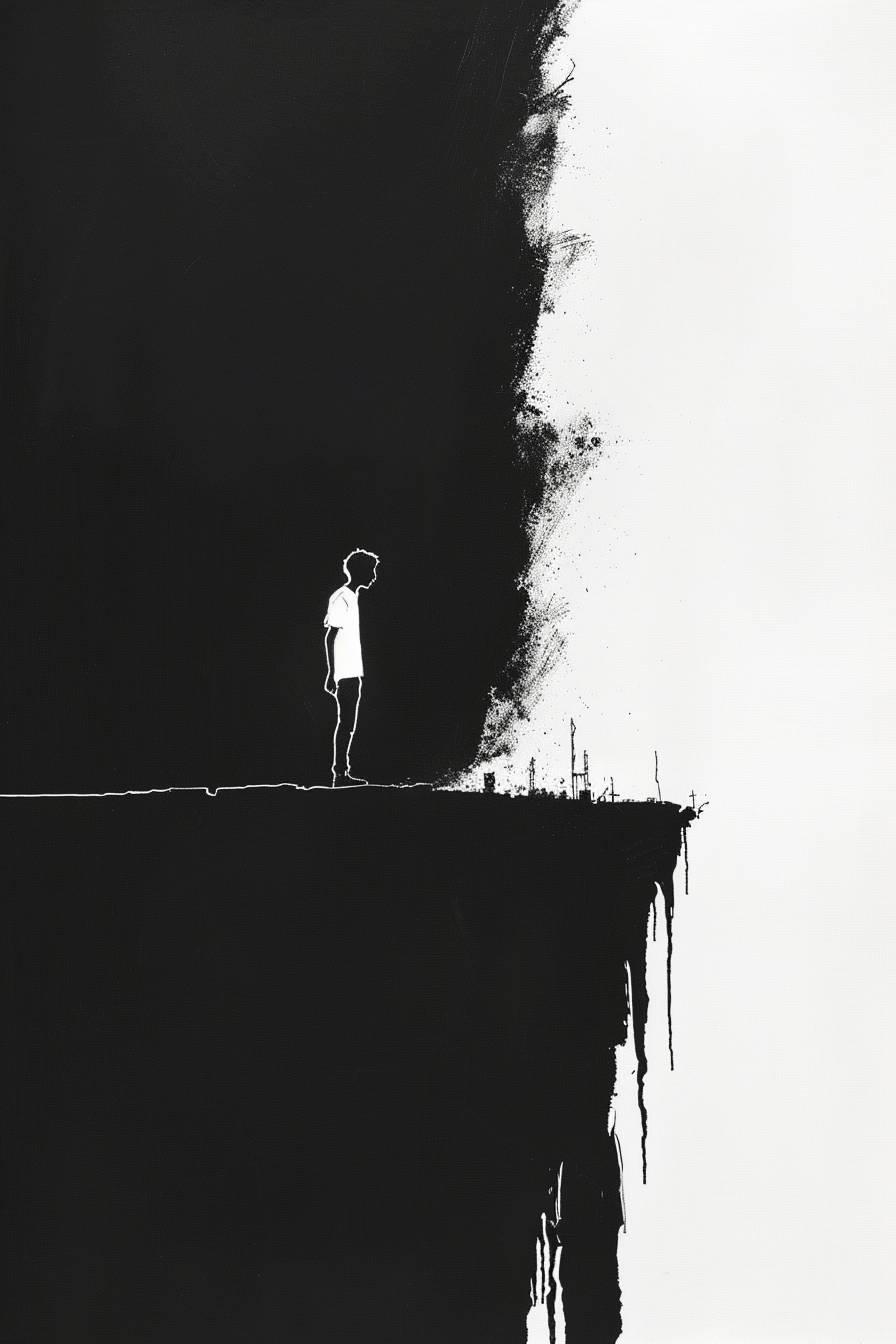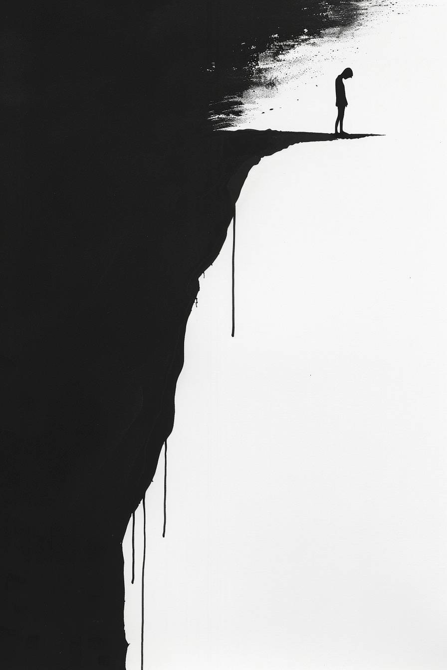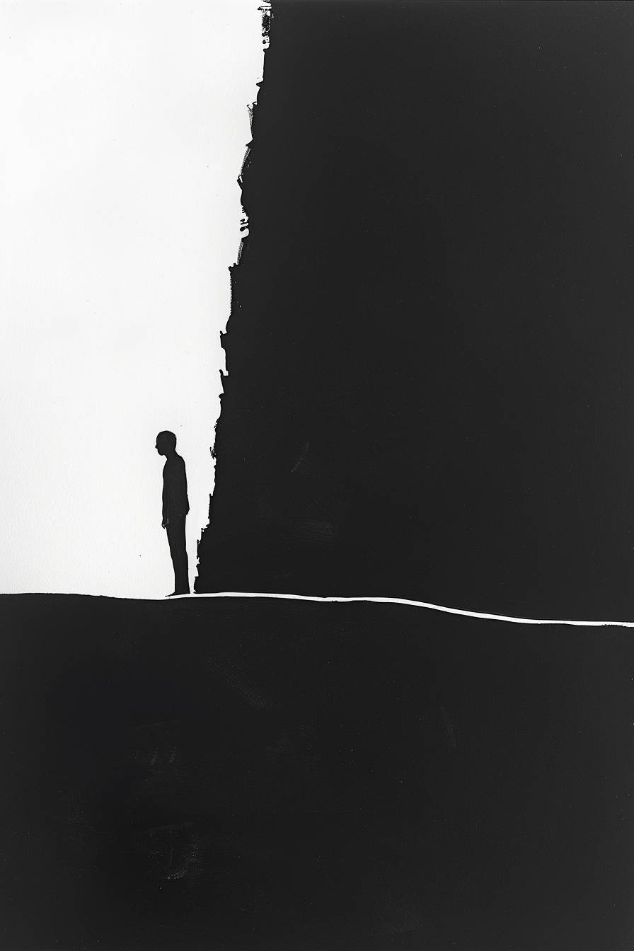 A minimalist ink drawing by Shigeo Fukuda of a man lost deep inside himself, flat black background. --ar 2:3 --v 6.0