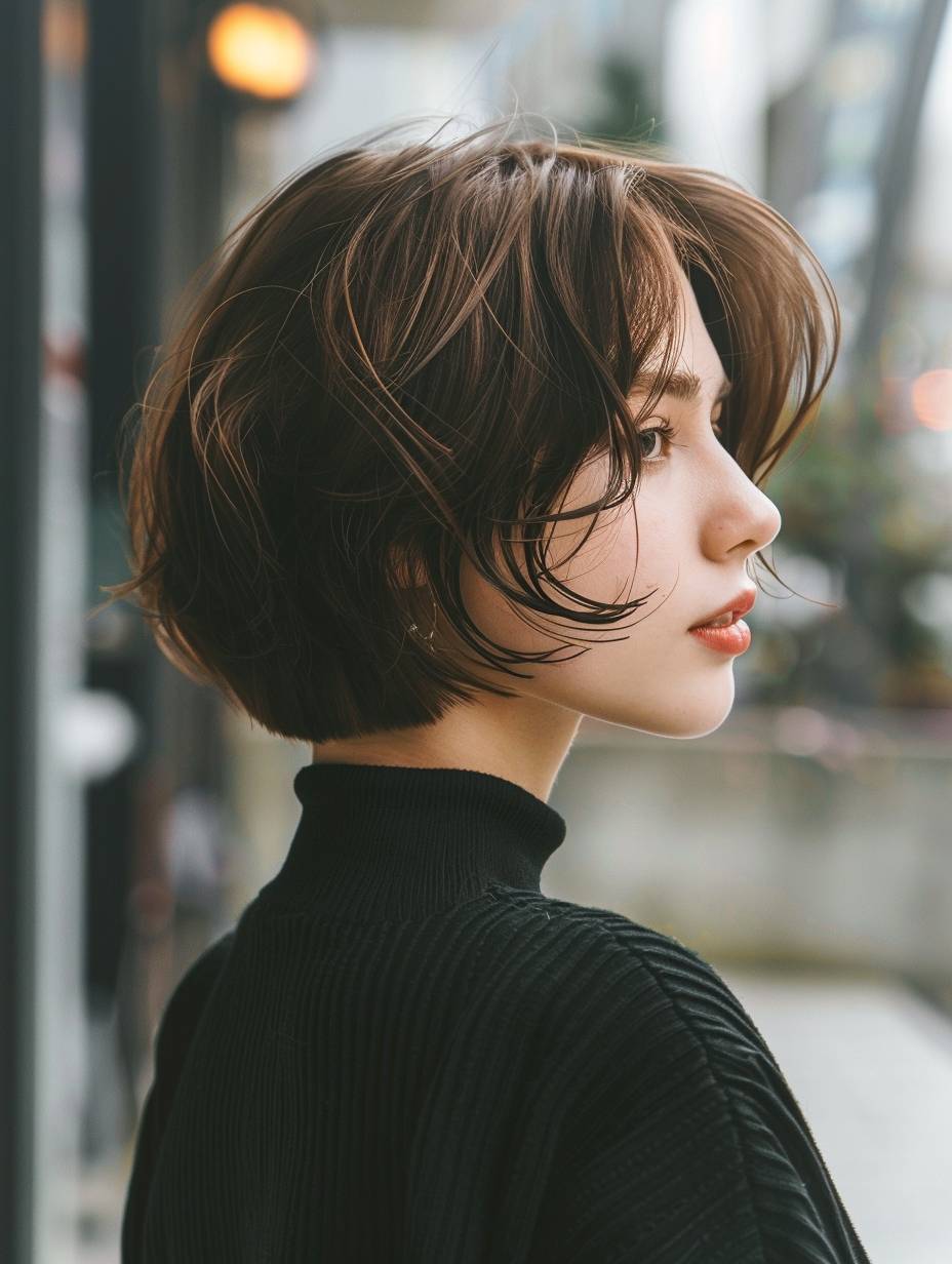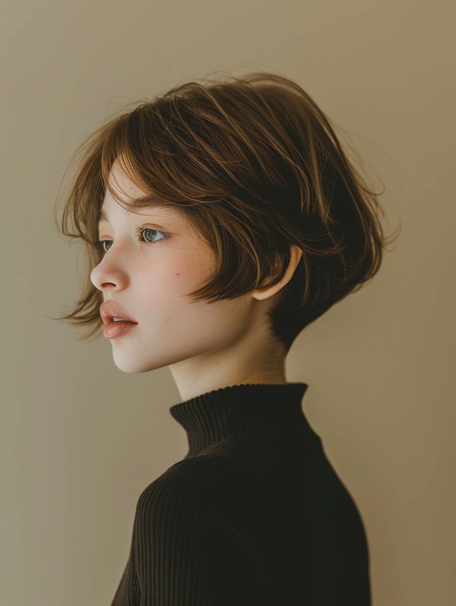 一張女性頭髮背影的照片。她是一位可愛的18歲日本女性,天然短髮,髮色較淺。她的側面稍微傾斜。美容院風格的照片,背景是一個時尚的美容院。