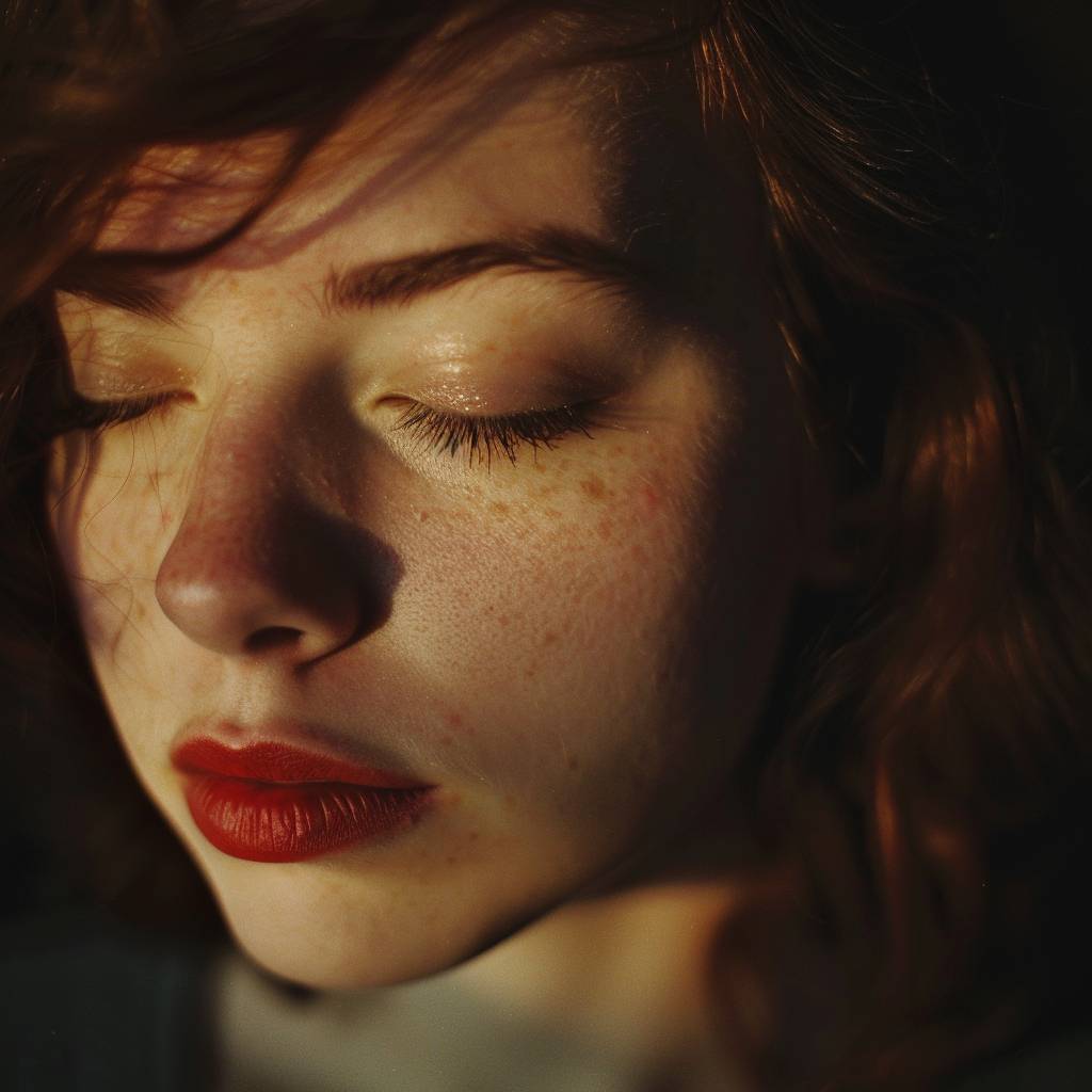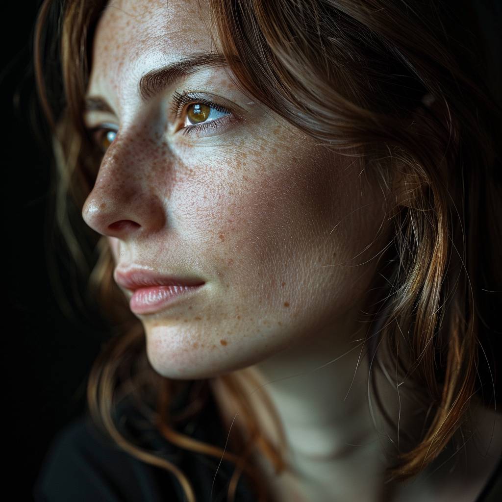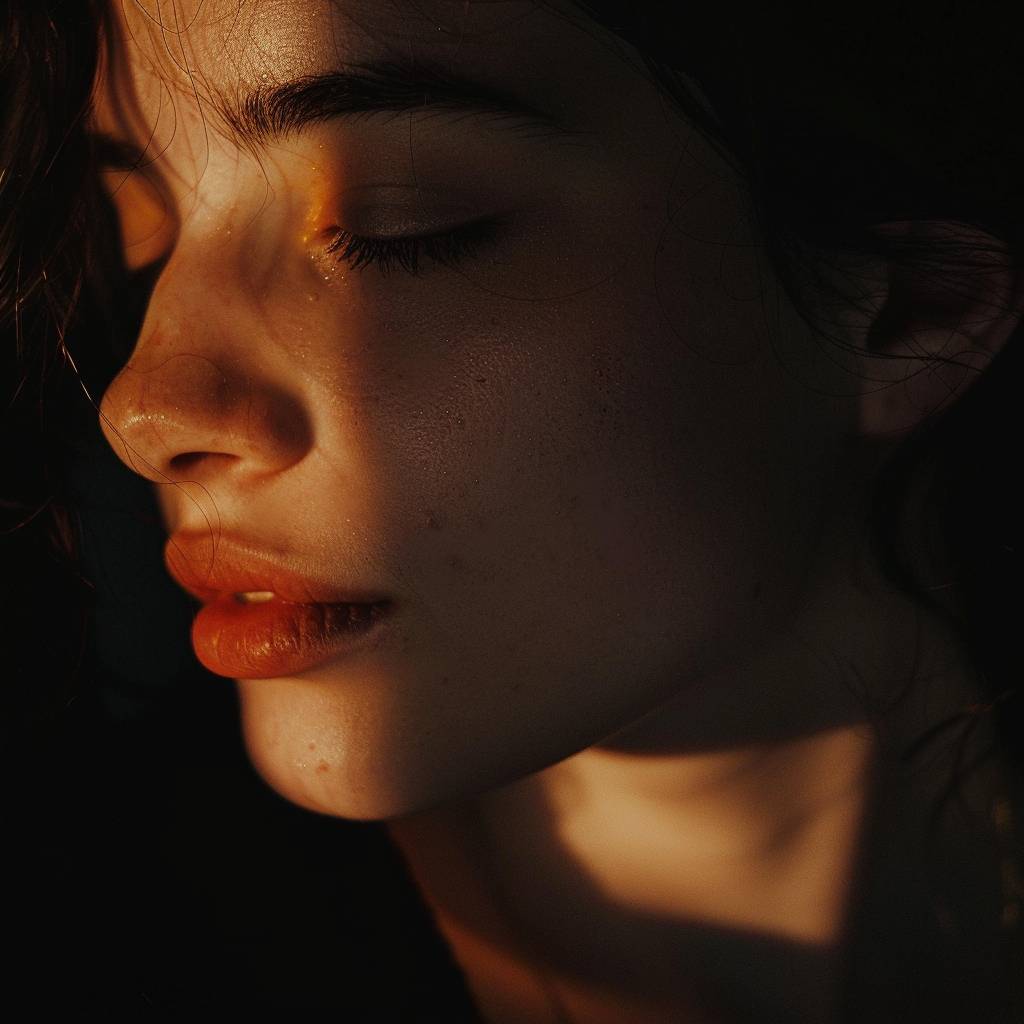 一個被側面照亮的女性特寫肖像,鏡頭拉遠。