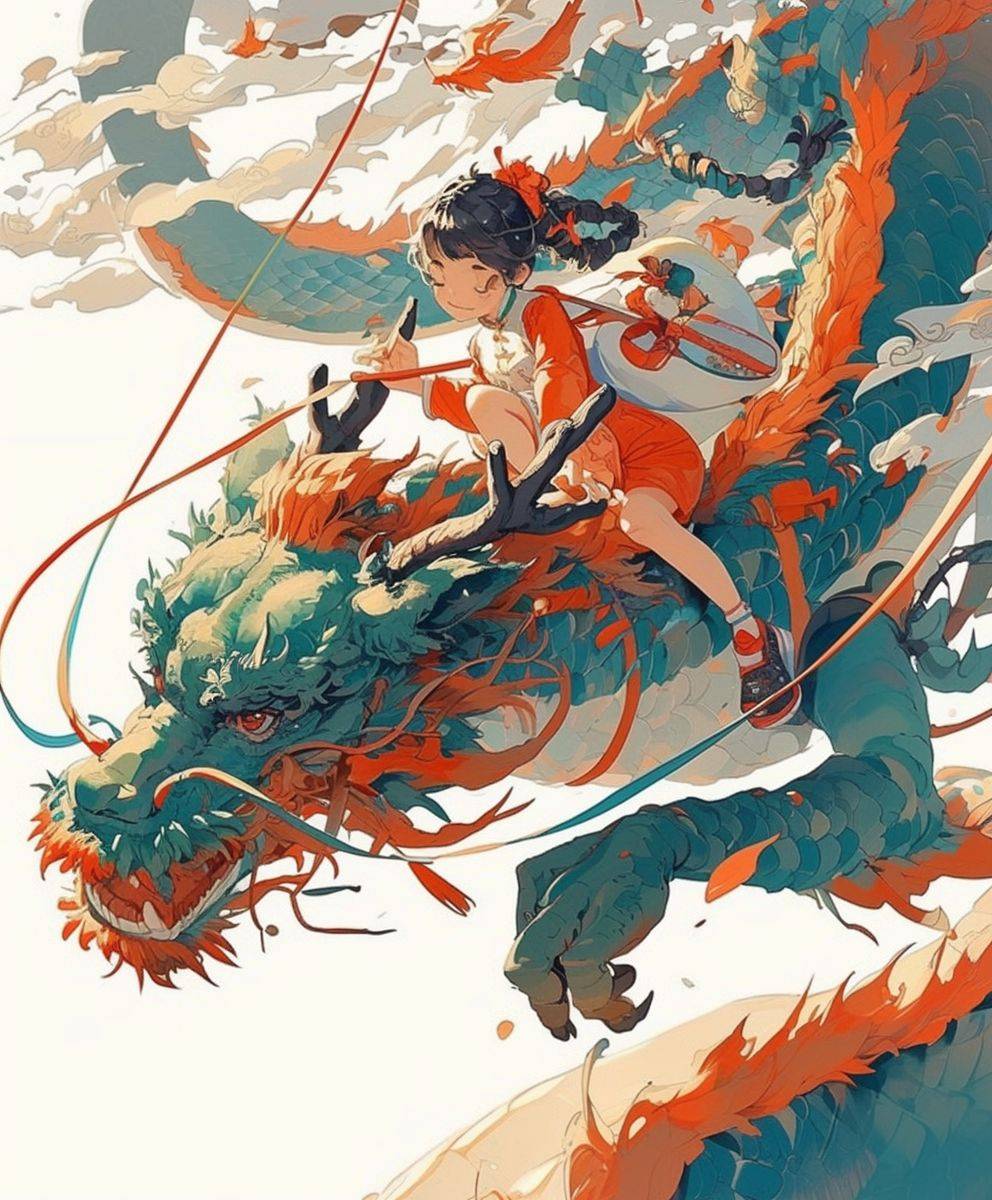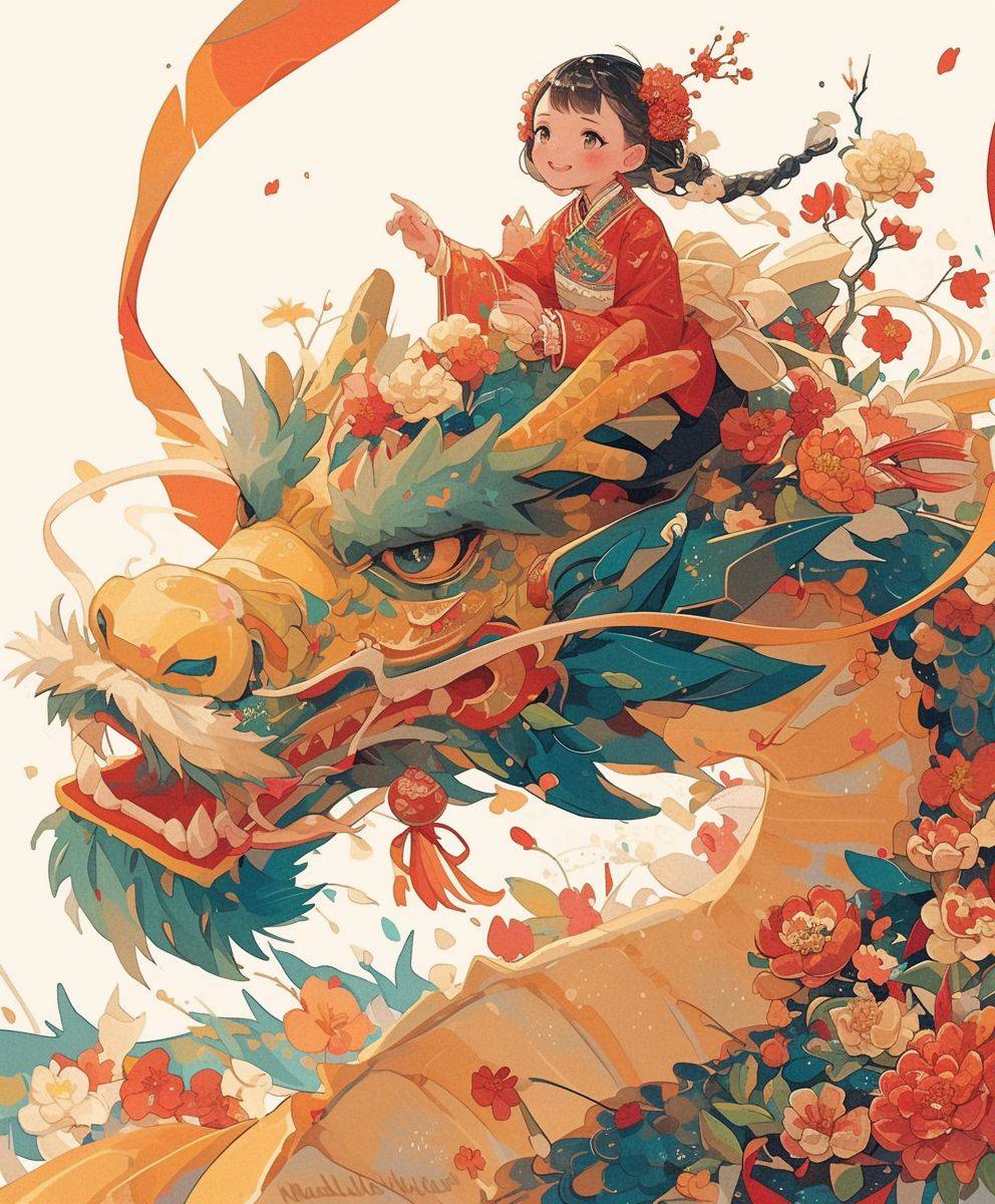 A Chinese girl rides a Chinese dragon, white background, graphic illustration, New Year atmosphere, super details, simple details --ar 5:6 --niji 6 --stylize 180