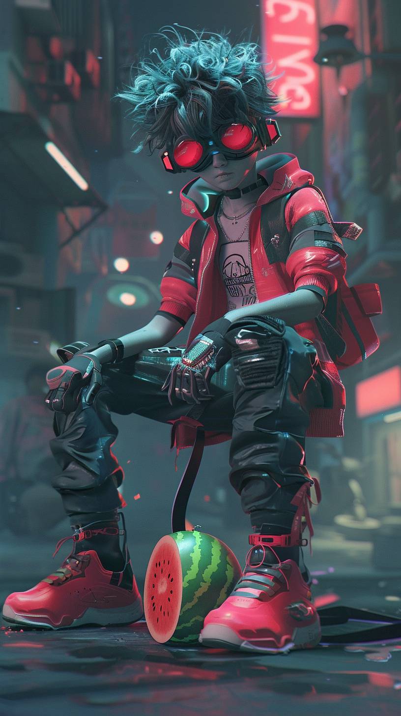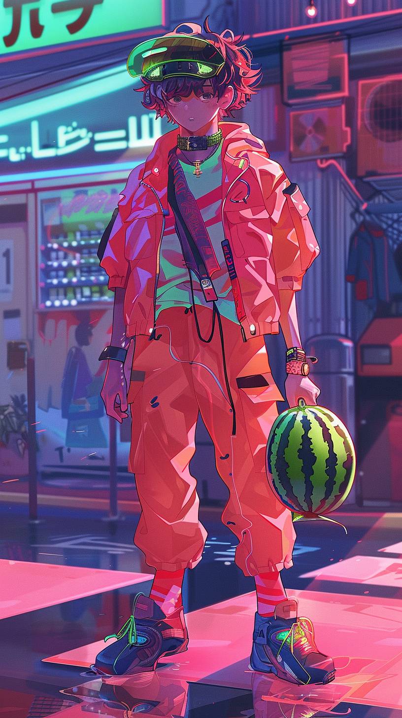 a anime,watermelon boy character,hard,cool style,futuristic --ar 9:16 --v 6.0