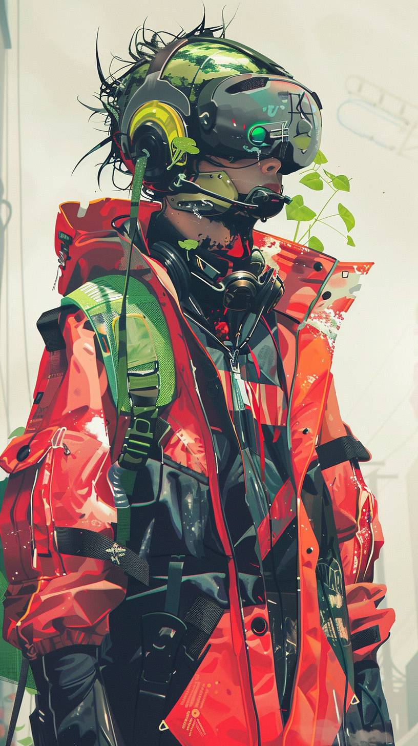一位動漫中的西瓜男孩角色,硬朗,酷炫風格,未來主義。