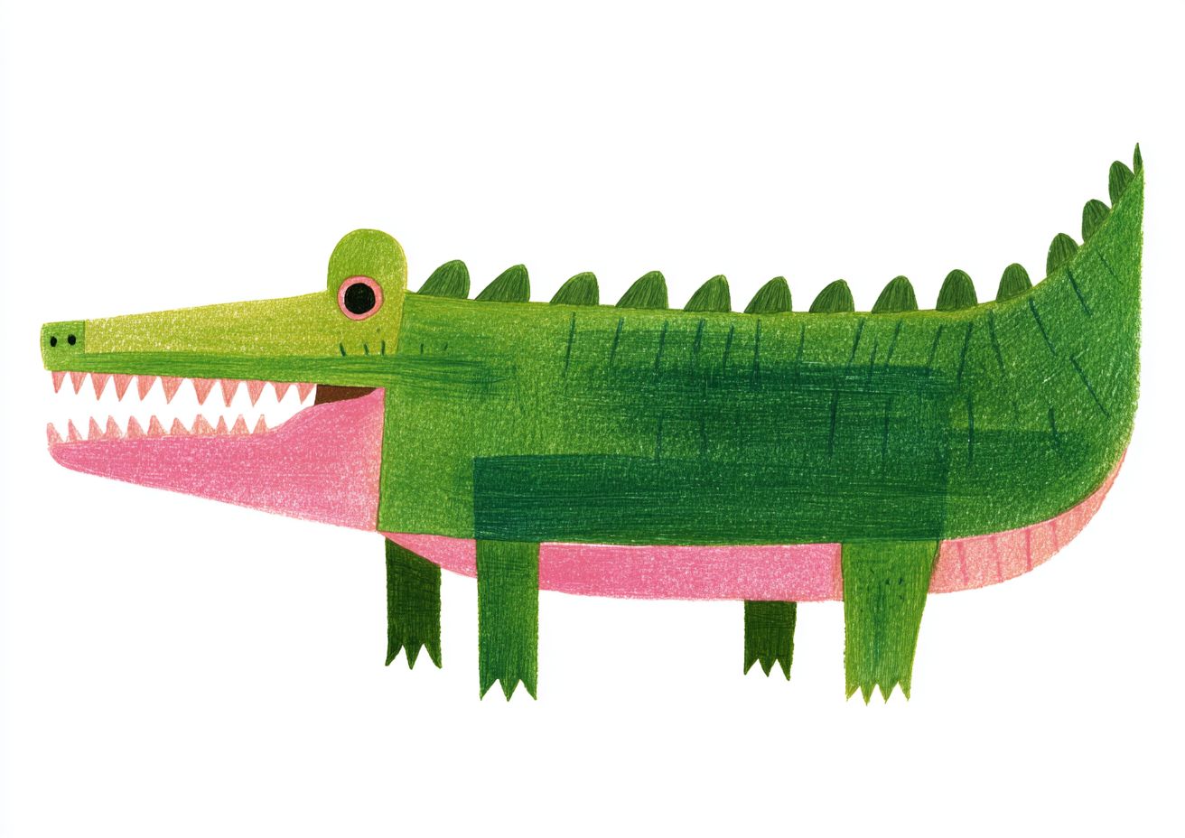 一隻全身是綠色的鱷魚,粉紅色的牙齒,採用亨利·馬蒂斯和竹正亮的風格,水彩紙上,白色背景,簡單的兒童書插圖風格,簡單,可愛,完整的身體。