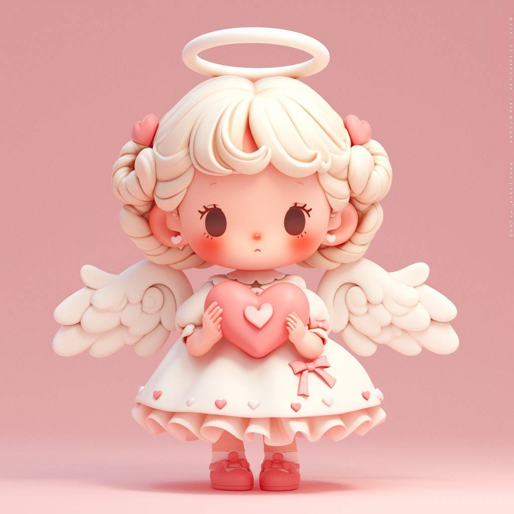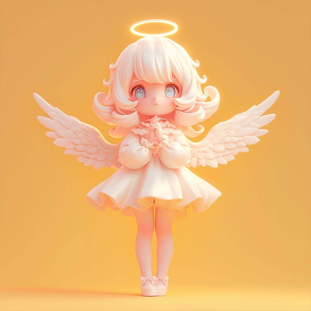 Super cute girl IP by pop mart, Bright Eyes, Cherub, little white skirt, clay, models, blind box toys, glossy and delicate, clean background, good shine, full body, 3D rendering, OC rendering, best quality, 4K, super detail --niji 6
