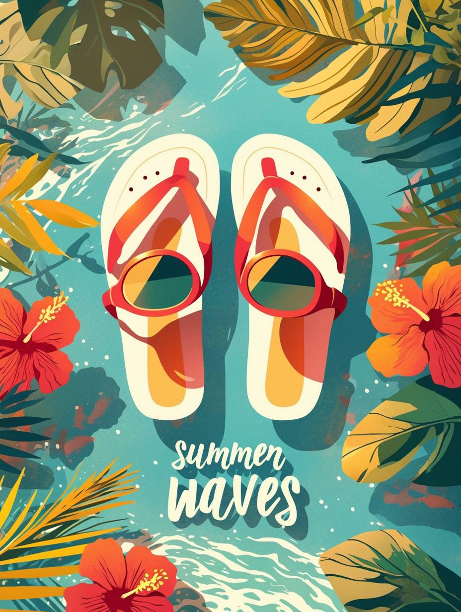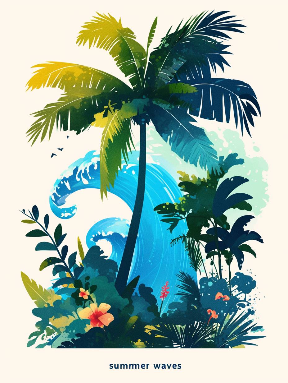 A poster with the text "summer waves", minimalistic, retro, vector illustration in the style of John Holcroft for Atey Ghailan style, white background, t-shirt print design, no mockup or borders, only sticker outline on all edges of each element. --ar 3:4 --s 180 --niji 6