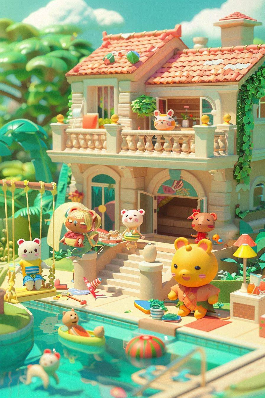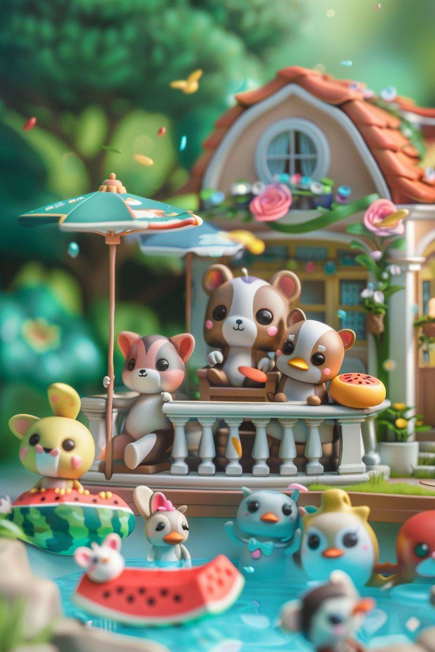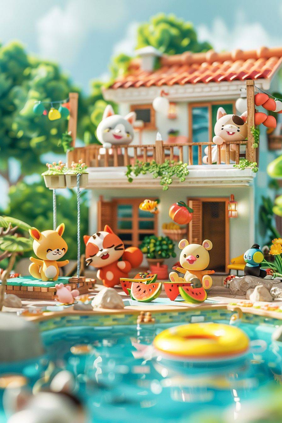summer animals villa party, miniature, cute animals play joyfully,friends gather on the balcony, in Animal Crossing Friends Club style, laughter and joy, enjoying summer,dispersion, close up, Energy, happiness, delight, clay material, perfect soft light, bright and colorful, fixed animation, exquisite facial features, clear outline structure, movie perspective, isometric, swimming pool, watermelon, garden, swing, swimming ring, little yellow duck hovercraft, volume, brushrendering, 3D, octane rendering, low detail --ar 2:3