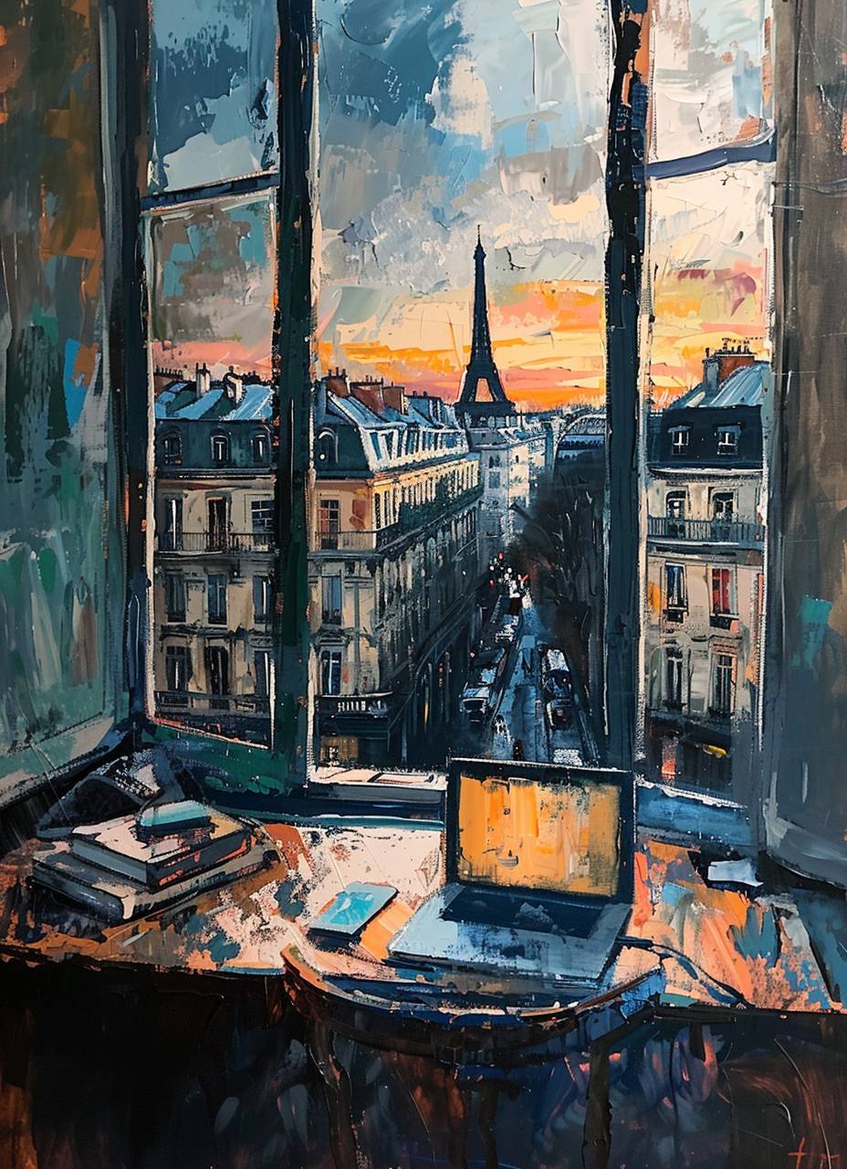 a painting of a modern desk with a laptop by a window overlooking Paris --ar 8:11 --v 6.0