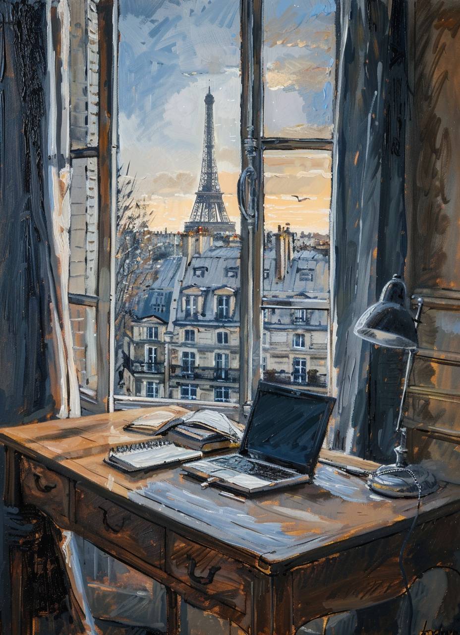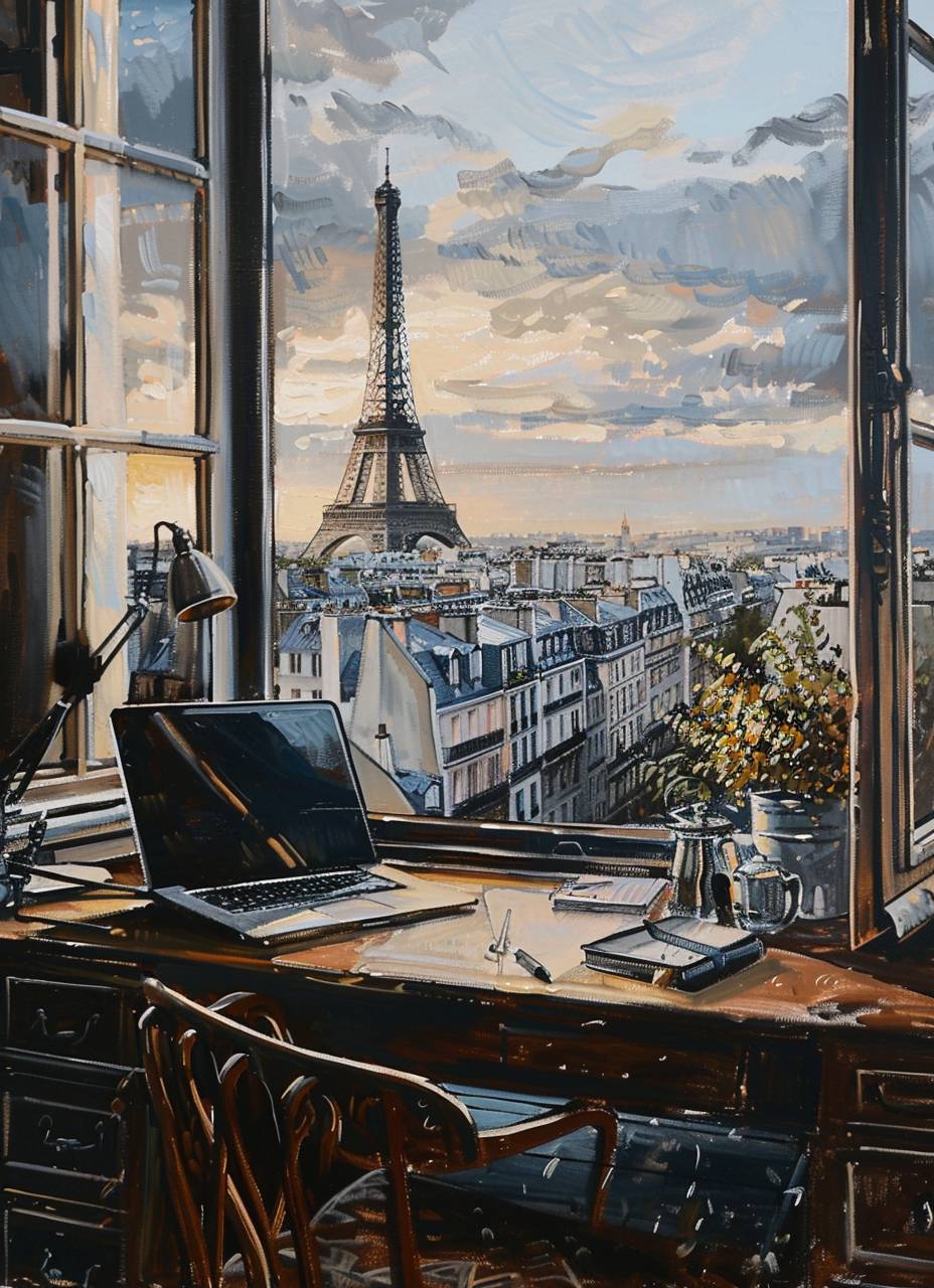 一幅現代書桌上放著筆記本電腦,窗外可以看到巴黎的畫作