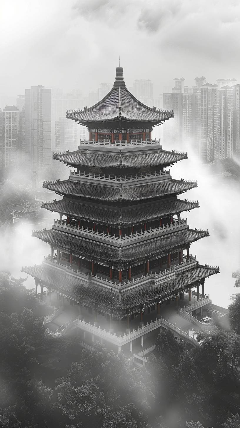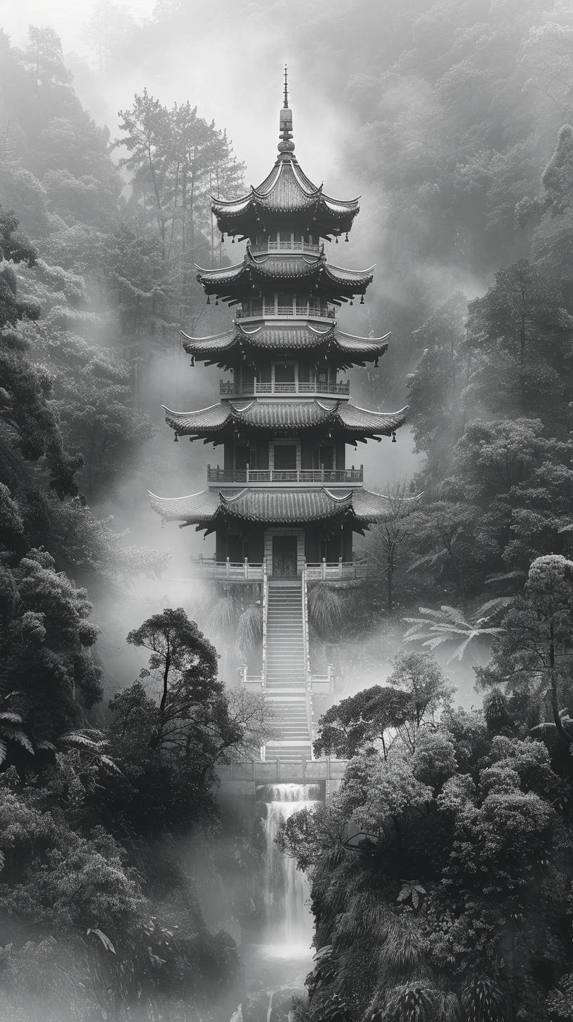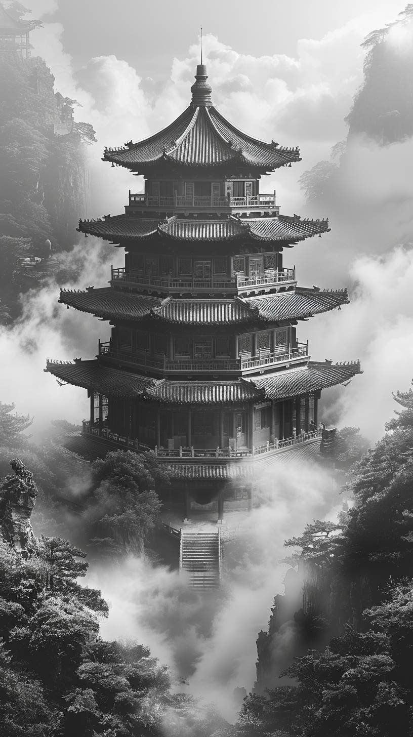 black and white photo of Distant Chinese temple emerging from the clouds stands out in the moonlight against a black background, seen from above, pictorialism --ar 9:16 --style raw --s 1000 --v 6.0