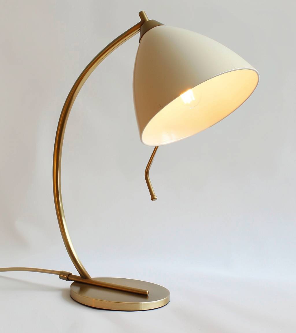 這是一款優雅的銅質桌燈,具有拱形設計,配有奶油色的燈罩,能為工作空間提供柔和的照明。燈具的焦點是面部,背景為白色。