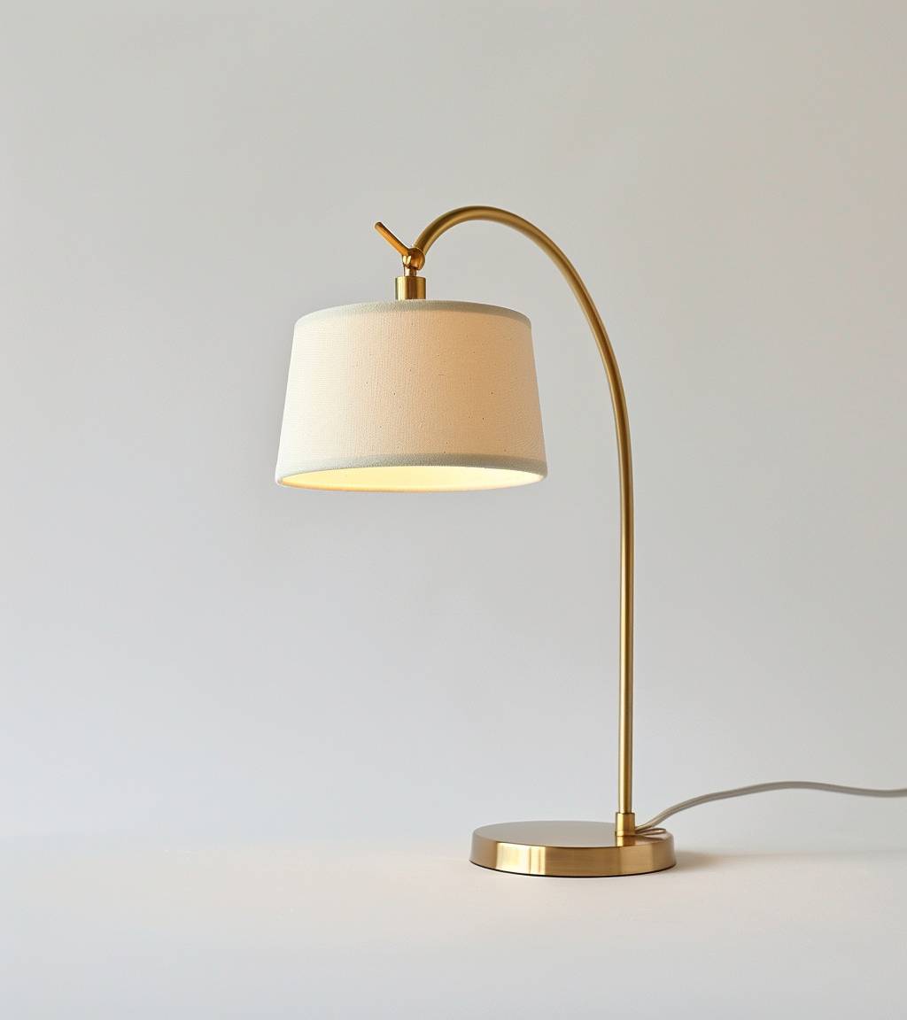 A sleek brass desk lamp with an arched design, featuring a cream-colored shade that casts gentle illumination on the workspace. The lamp has a focus on the face against a white background, in the style of face , white background. --ar 42:47 --v 6.0