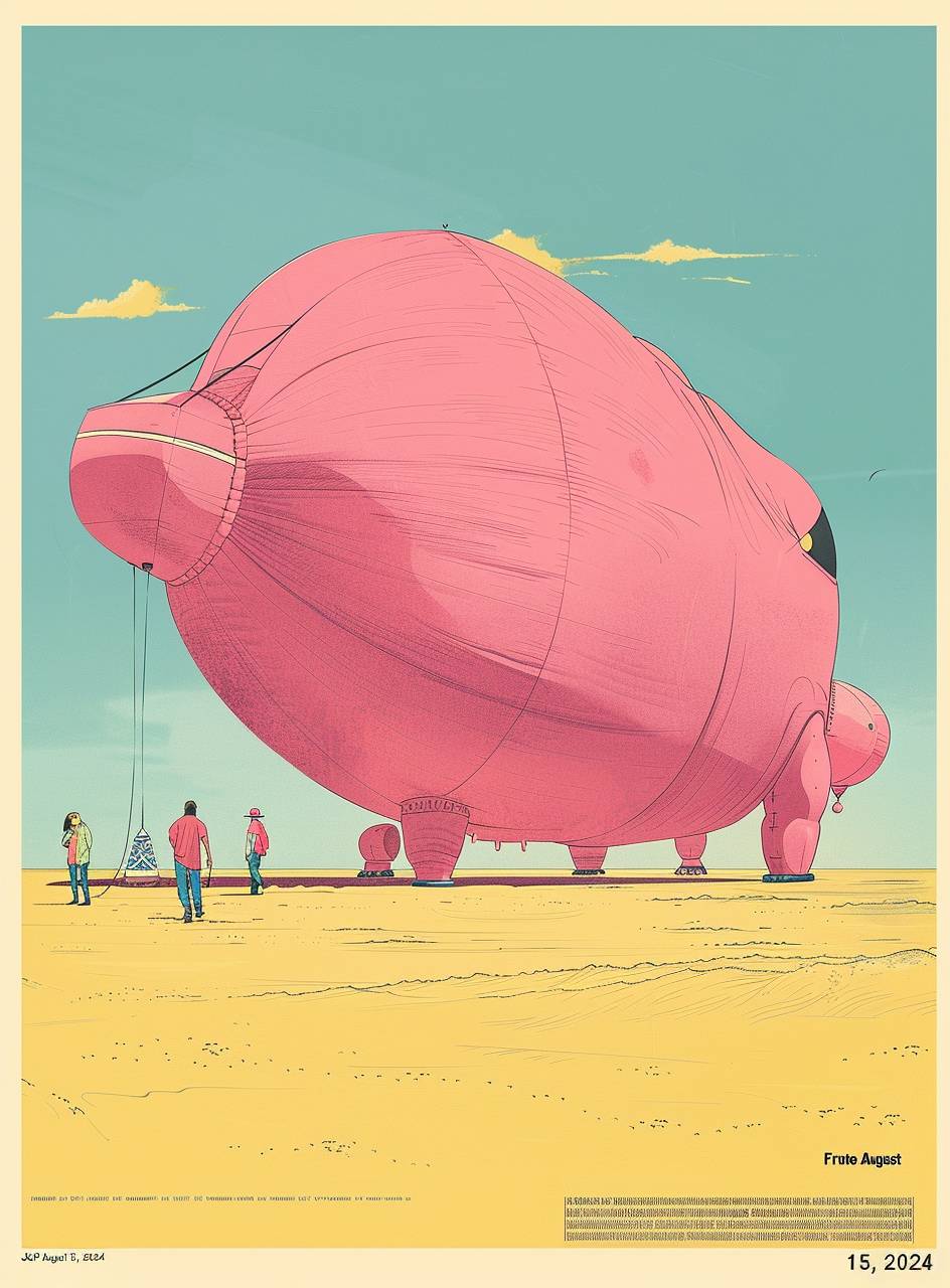 1980s poster of the text "Frute J&P August 15, 2024" featuring people in the desert near an colossal scale inflatable pink camel, illustrated in the style of Moebius, minimal design, 2D, flat colors, vintage look. --ar 39:53 --style raw --stylize 65 --v 6.0