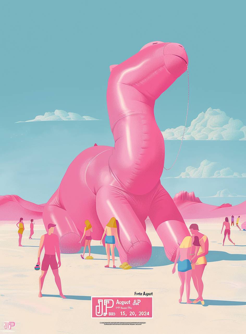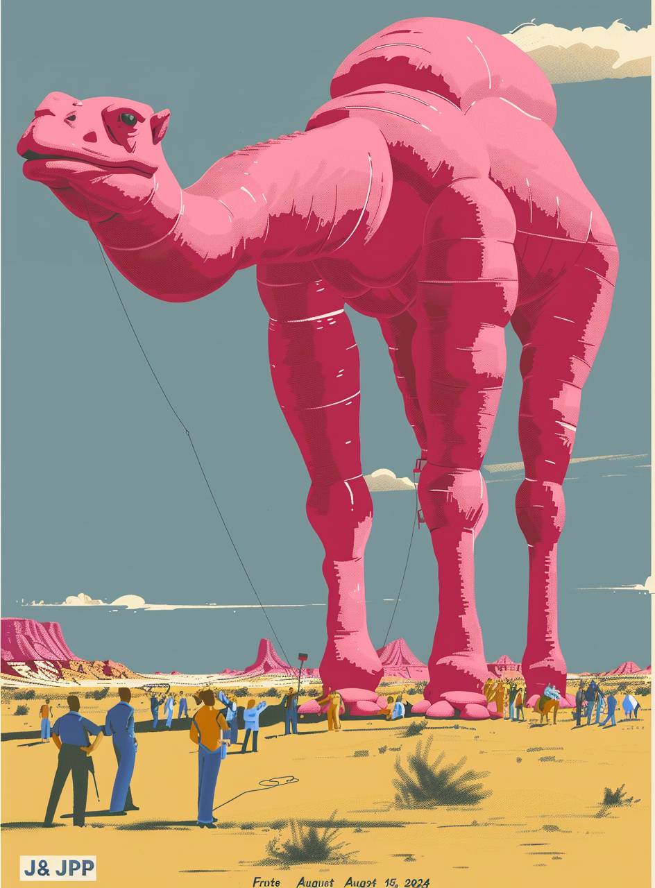1980年代的海報,文字為「Frute J&P 2024年8月15日」,背景是人們在沙漠中近距離觀看一隻巨型充氣粉紅色駱駝,採用Moebius風格,極簡設計,2D,平面色彩,復古外觀。