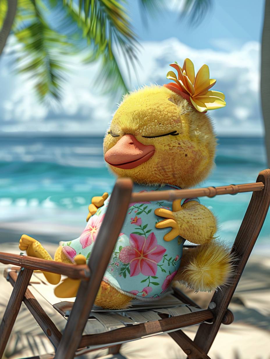 3D,可愛圓潤的毛茸茸小雞,人性化,穿著漂亮的花裙子,神情滿足,人性化,穿著時尚休閒服,閉上眼睛,懶懶地躺在海邊的沙灘椅上,周圍是椰子樹和海洋,在一個非常美麗的地方,卡通風格,簡約主義,佳能相機,工作室燈光