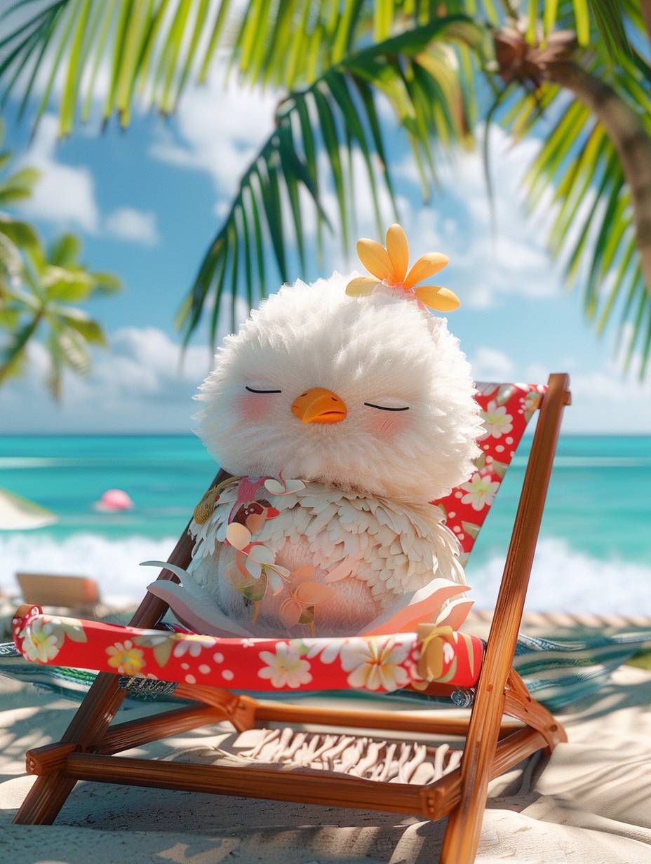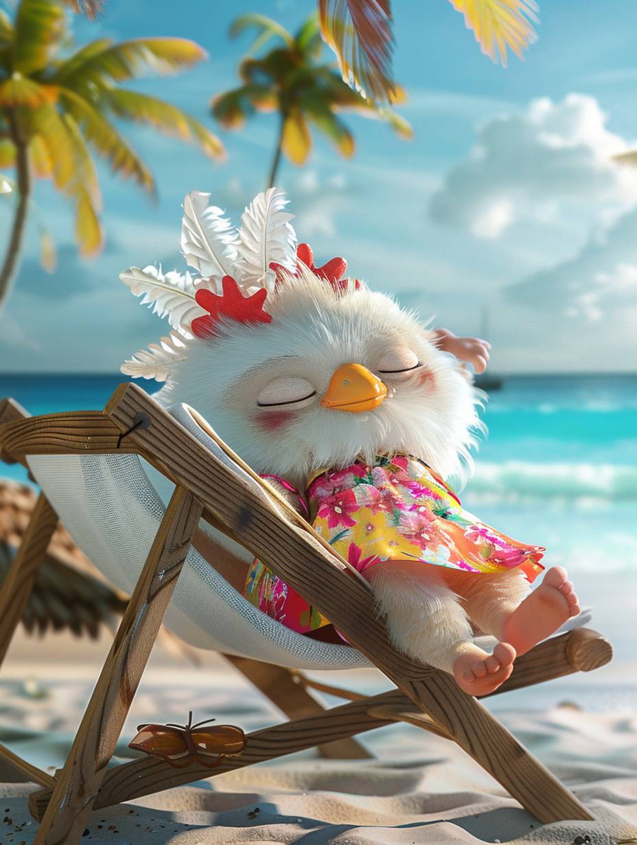 3d,cute chubby fluffy little Chicken,Anthropomorphized, wearing a pretty floral dress,a contentedexpression, Anthropomorphized, wearing stylish casual clothes, with eyes closed, lazily sleeping on a beach chair by the seaside, surrounded by coconut trees and the ocean, in a very beautiful place, cartoon style,minimalism,Canon camera, studio light --ar 3:4 --style raw --v 6.0