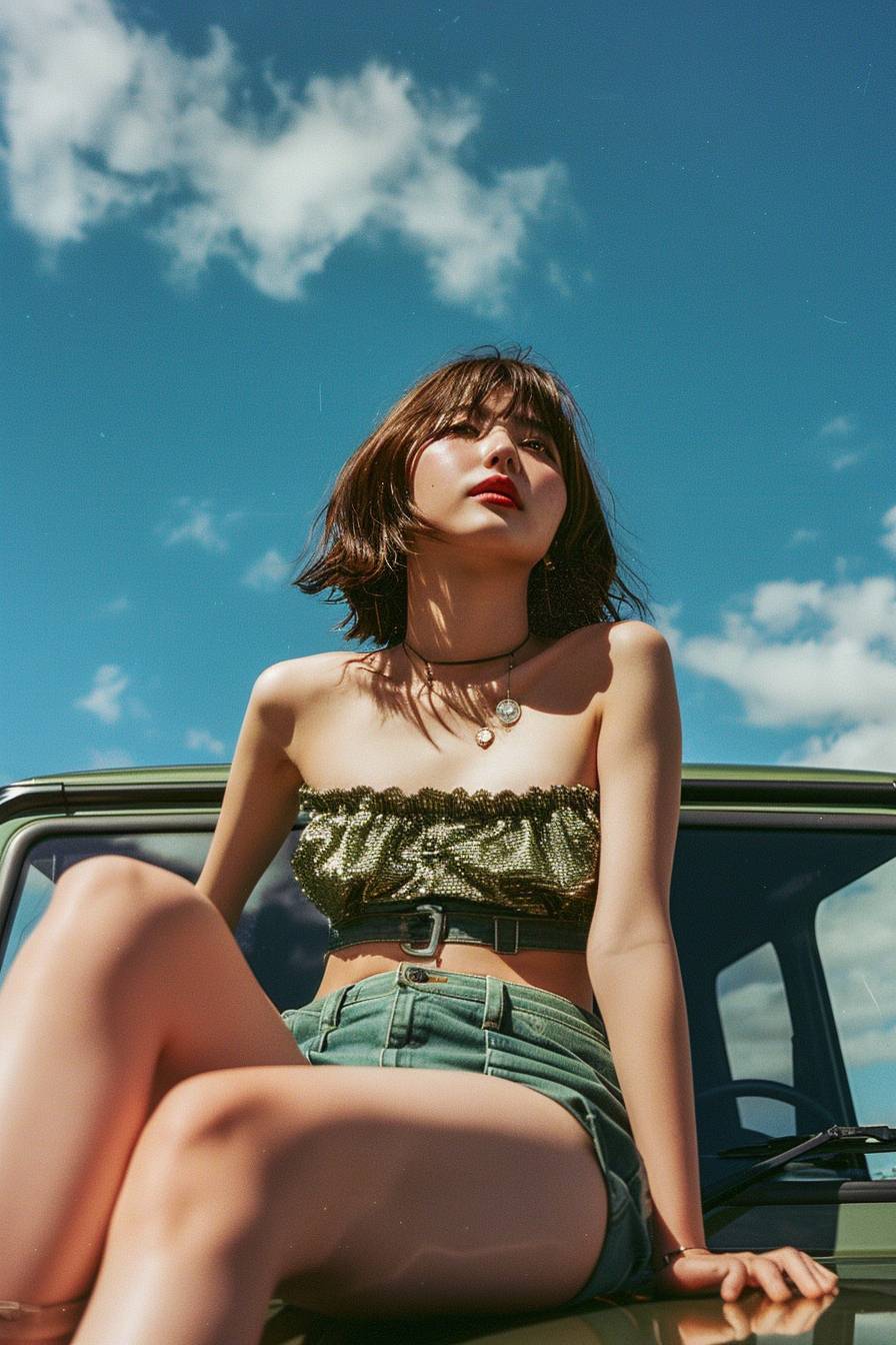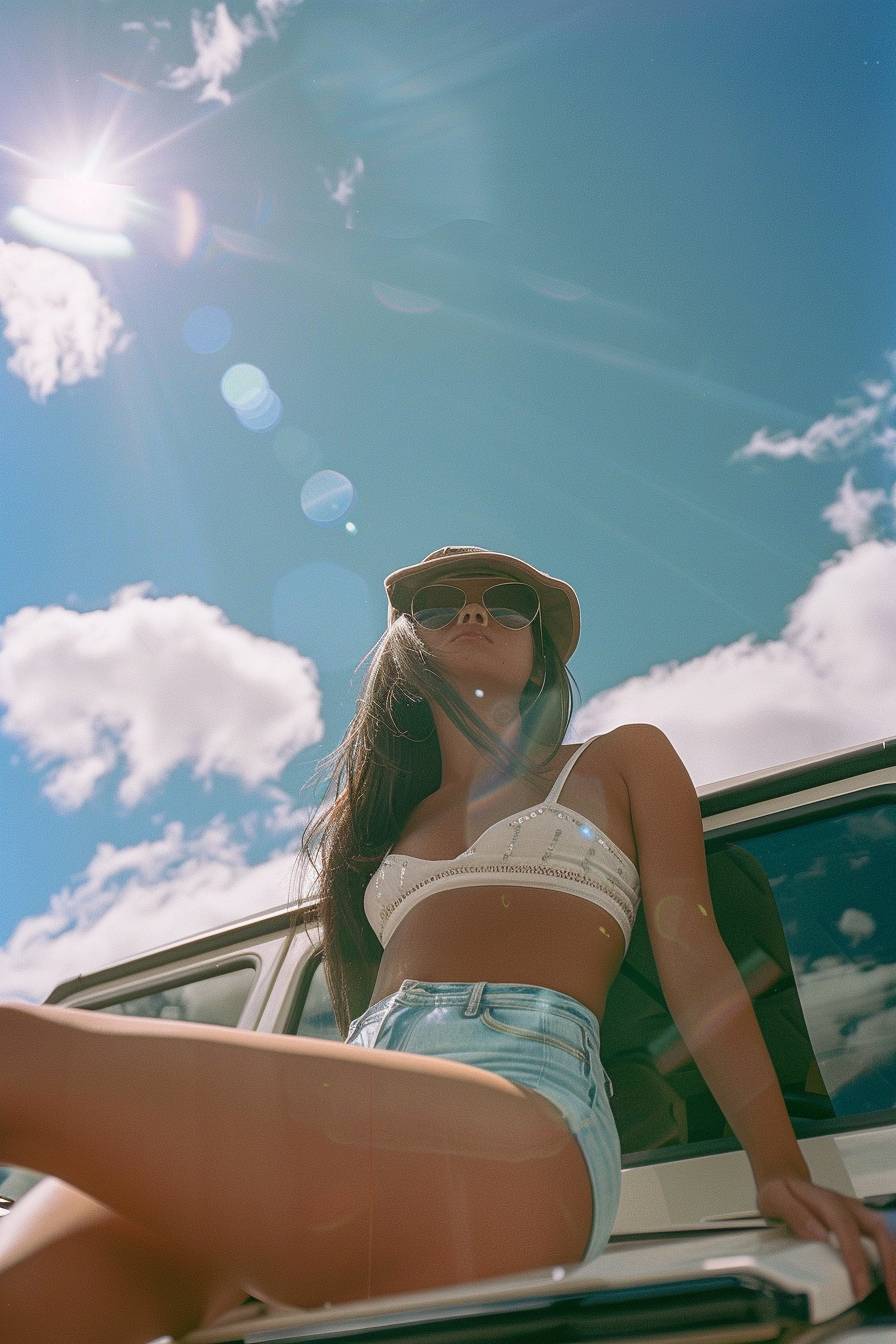 film photo. super wide lens. reflection of car hood. car hood reflects blue sky and clouds of summer. beautiful japanese woman sitting on the car hood of mercedes g-class. beautiful thighs. --ar 2:3 --style raw --stylize 80 --v 6.0