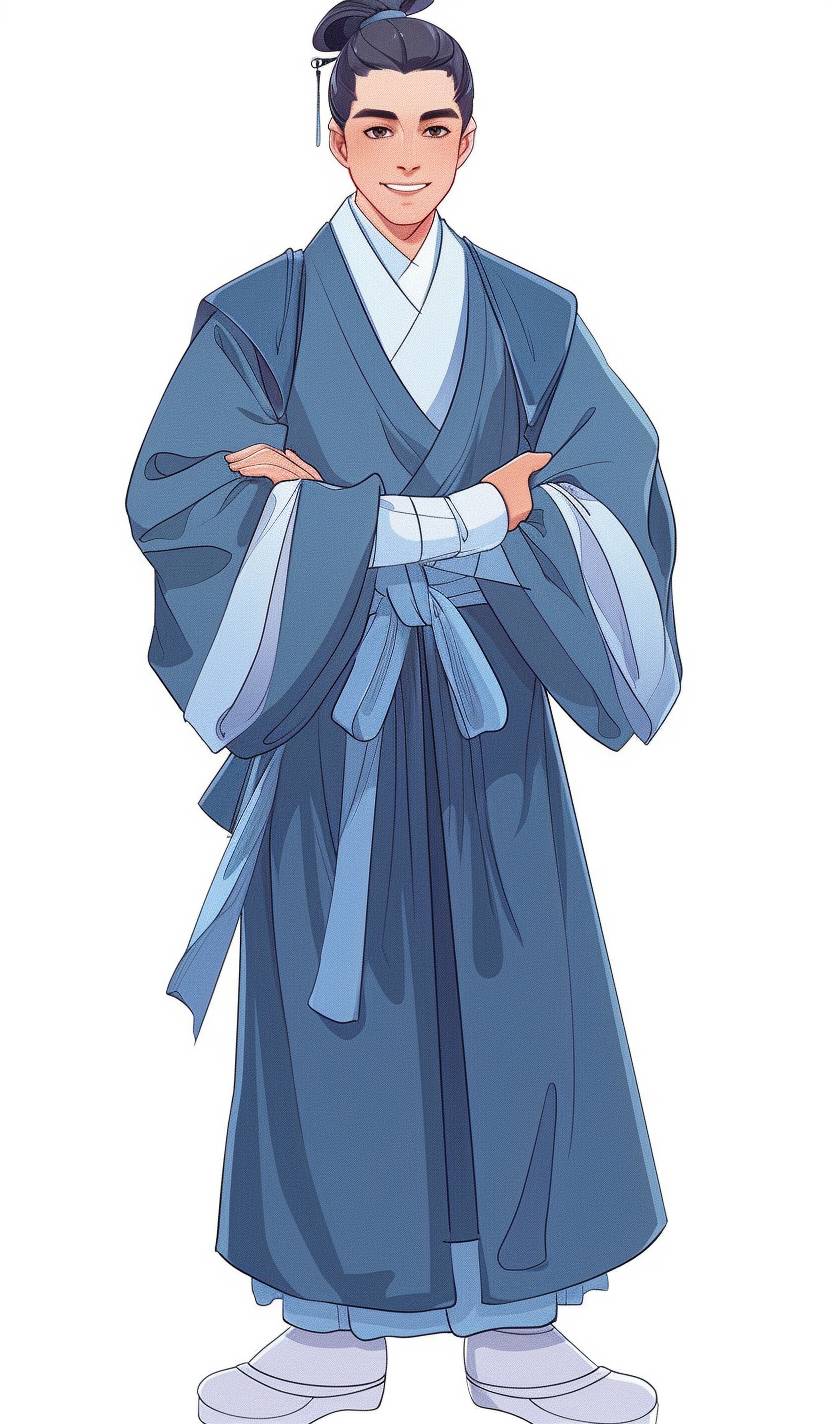 Cartoon style, full body shot of an ancient Chinese man wearing a blue Hanfu and white shoes, with his hands crossed on his abdomen. His black hair is tied into two small braids on both sides of his head. He is smiling and wearing long sleeves that reach down to his knees, cartoon character design, white background. --ar 75:128 --v 6.0
