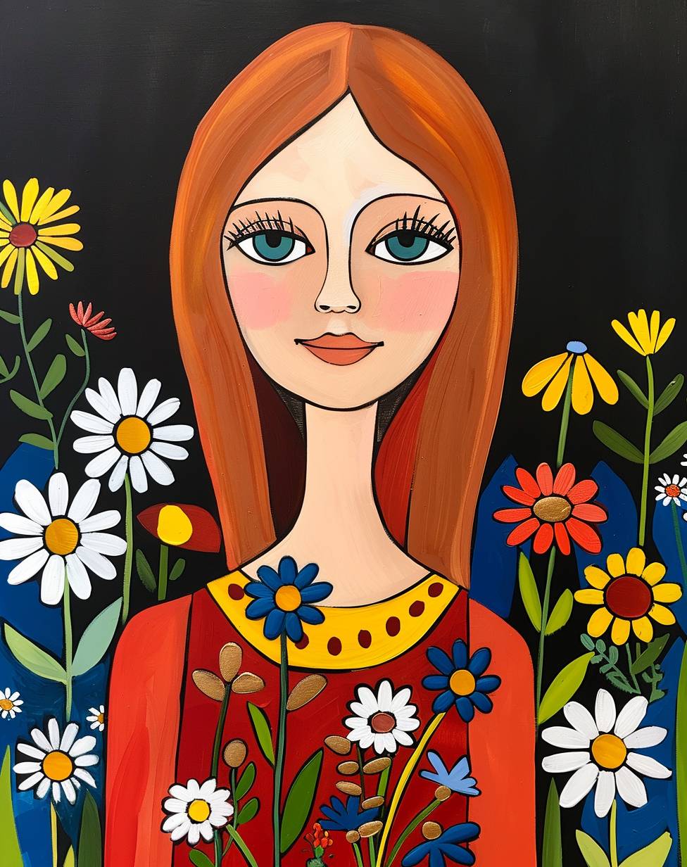 遠處的女孩,綠色的樹木和草地,湖泊,簡單的插圖風格,扁平的繪畫,簡單的線條,實色塊,細緻的風景畫,兒童書籍插圖,有趣的人物設計,柔和的顏色,柔和的色調,卡通人物,兒童般的天真,清新優雅的背景,俏皮的紋理,簡單的設計,綠色樹木的田野,一個金髮公主在草地上奔跑,手裡拿著花袋,採用兒童書籍插圖的風格。