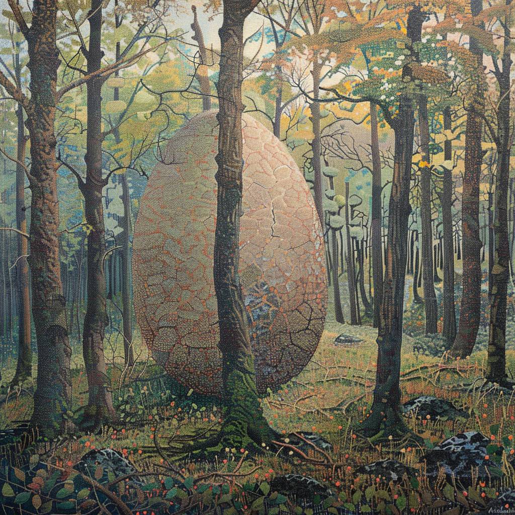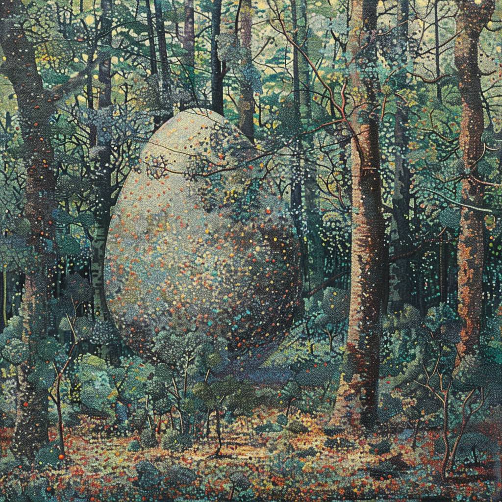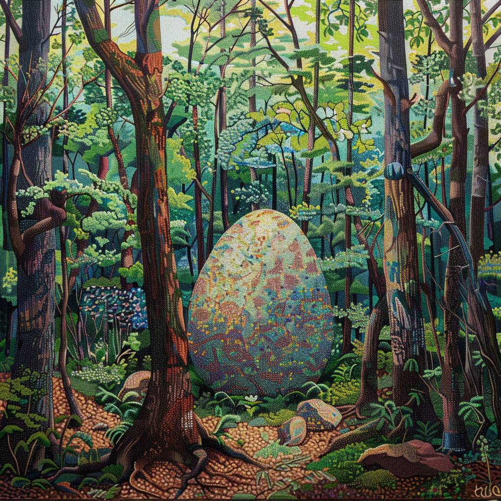 一個大雞蛋在森林中,以點彩畫風格描繪。場景中採用微小的色點來構建樹木和樹葉的形狀,雞蛋作為中央的細緻形狀。顏色鮮豔,綠色、棕色、藍色和黃色的色調交織在一起,形成自然的背景。森林茂密而複雜,雞蛋作為一個神秘的物體出現在這片美麗的點狀景觀中。