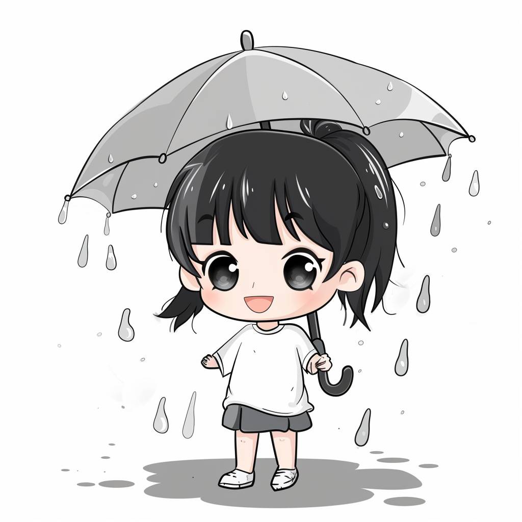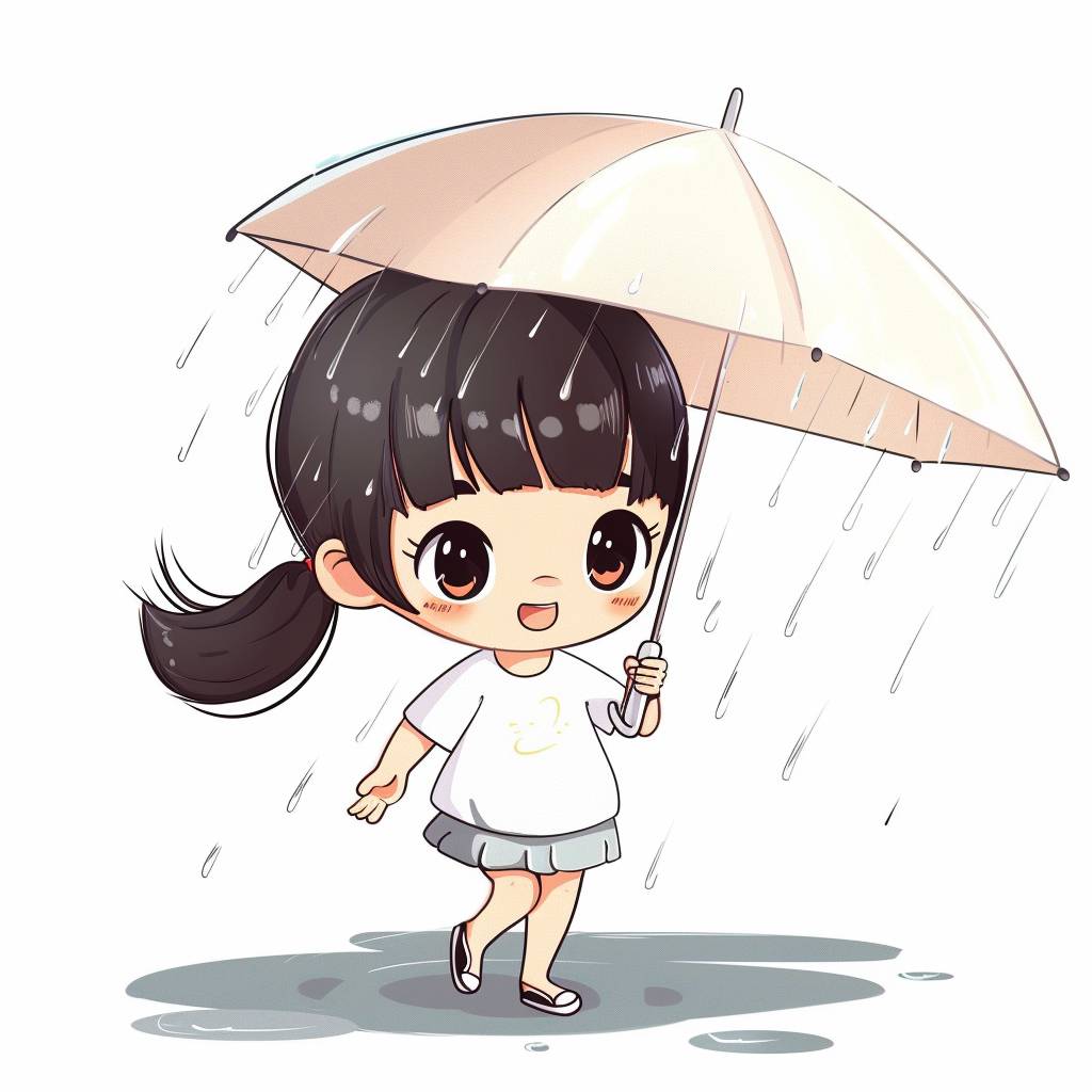 Cute Japanese cartoon character walking in rain wearing white Tshirt, clean white background, flat design, chibi style, cute expression, cute pose, simple hair shape, high resolution, Chibi style, Osamu Tezuka style, simple details, The little girl has big eyes and mouth open in excitement as she has an umbrella walking in rain. Keep the focus on the character design. --v 6.0