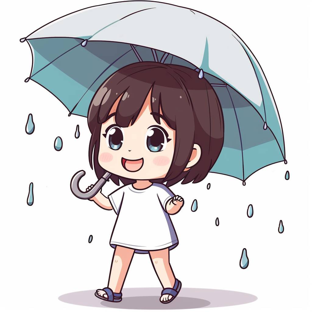 可愛的日本卡通角色在雨中行走,穿著白色T恤,表現興奮。
