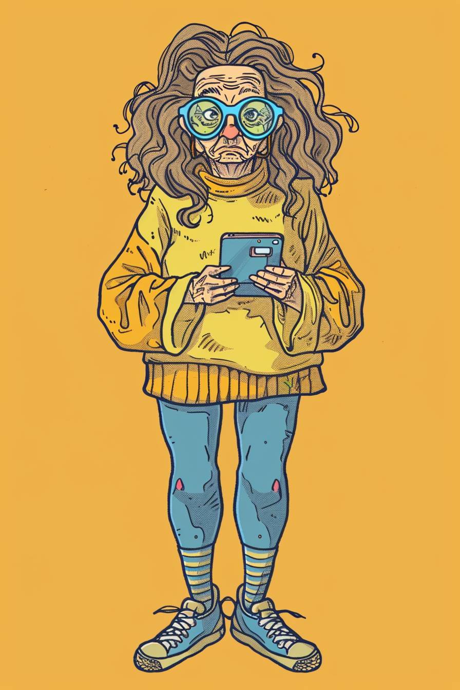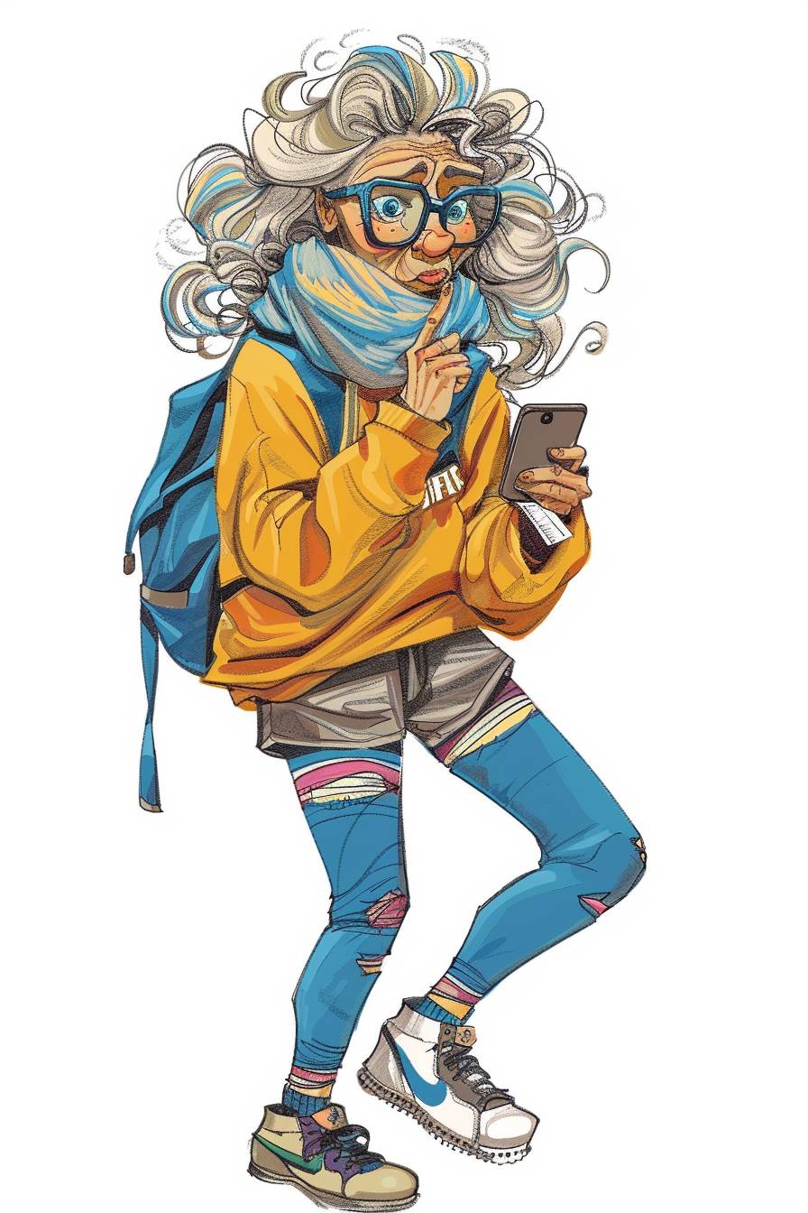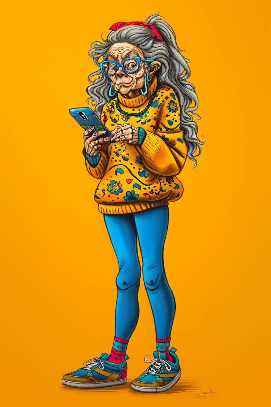 設計一款有趣的卡通T恤,描繪一位55歲的女士,她戴著大眼鏡,留著高高的波浪卷髮,穿著藍色的彈性緊身褲和黃色的毛衣,配有腿部暖腿套和運動鞋,手裡拿著一部三星手機。