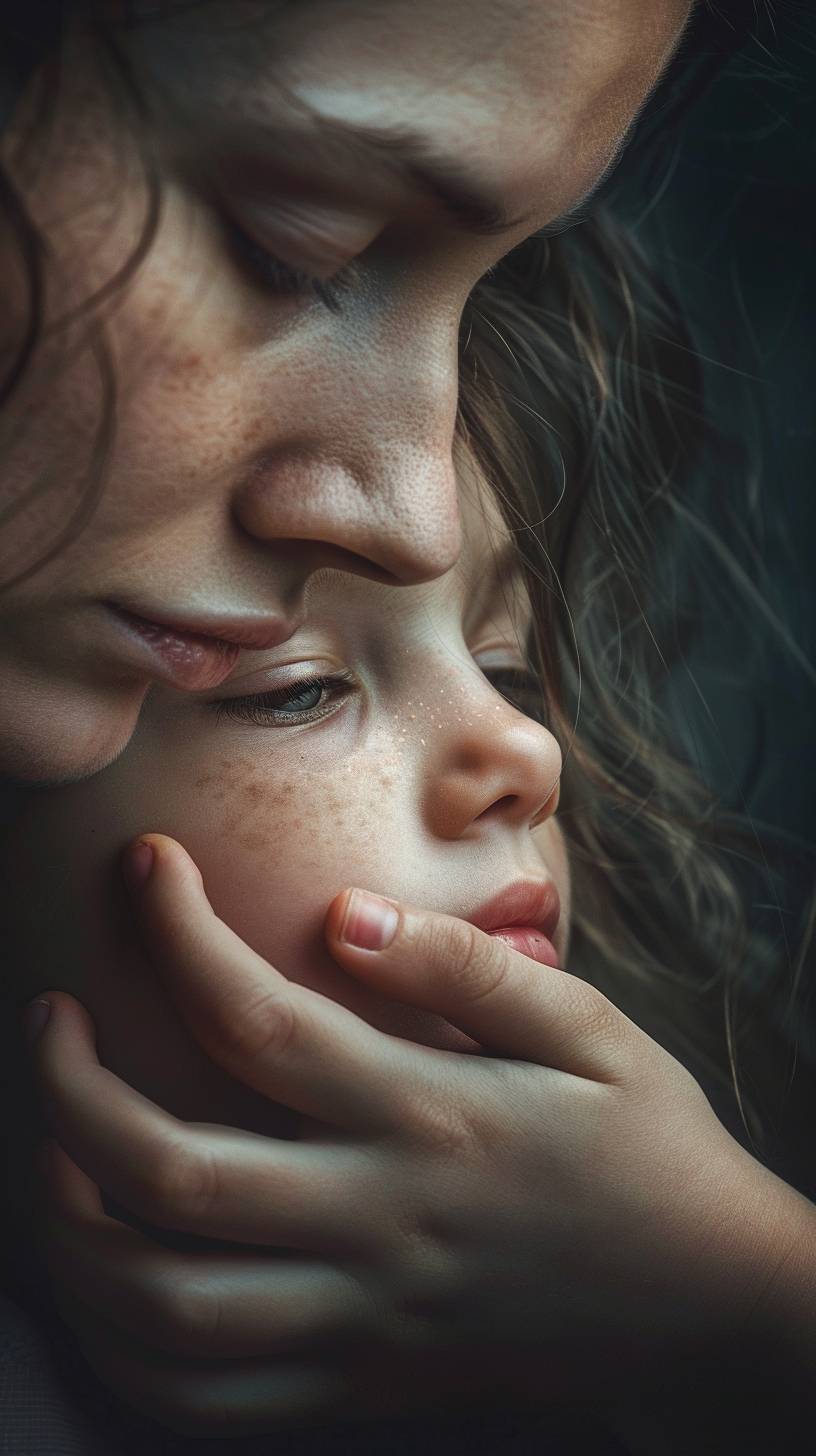Una visualización de una única mano estilizada femenina acariciando la cara de un niño muy hermoso. No hay nada más que la mano femenina y el rostro del niño. Rodeados de oscuridad, pero parece que están iluminados desde dentro. Toda la imagen tiene la calidad de una fotografía de alta resolución. Hay una sensación general tanto de belleza estética como de forma subyacente --ar 9:16 --v 6.0