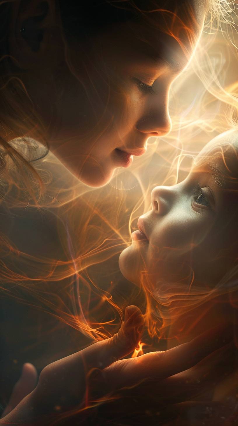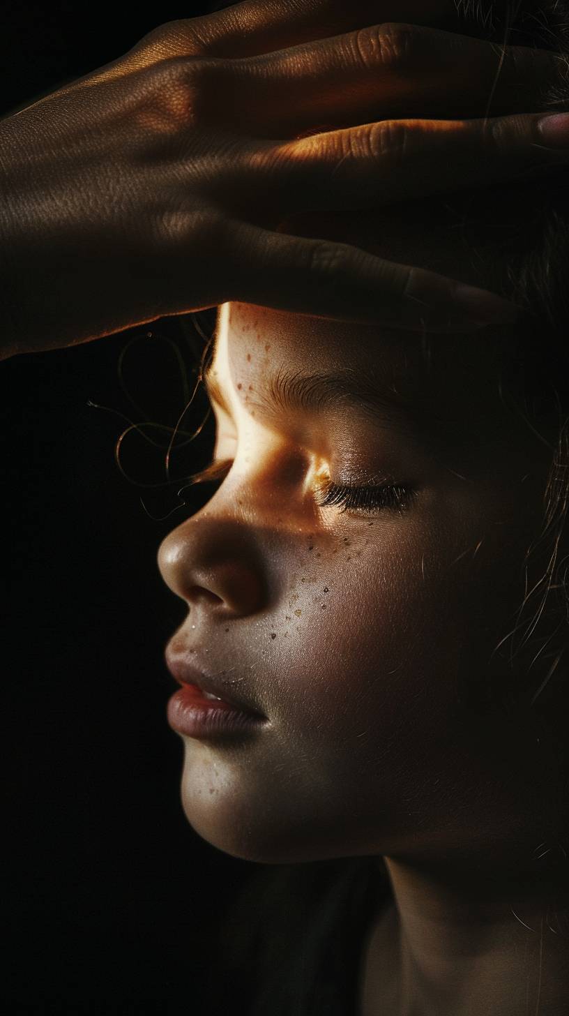 一隻風格化的女性手輕輕撫摸著一個非常美麗的孩子的臉。畫面中只有女性的手和孩子的臉,周圍被黑暗包圍,但似乎從內部散發出光芒。整幅圖像具有高清攝影的品質,給人一種美學與內在形態共存的感覺。