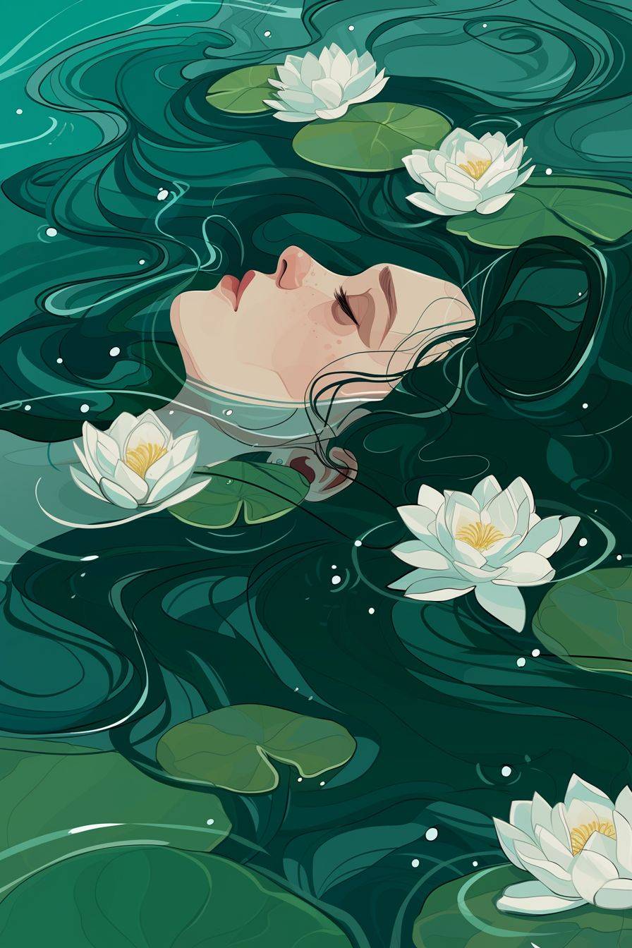奧菲莉亞在水中沉浸在水百合之間,呈現出飄逸的插圖風格,流動的超現實主義,寧靜的水面,流暢的線條,未來有機的藝術風格,裝飾藝術的曲線,天藍色和綠色,自然主義的海洋波浪。