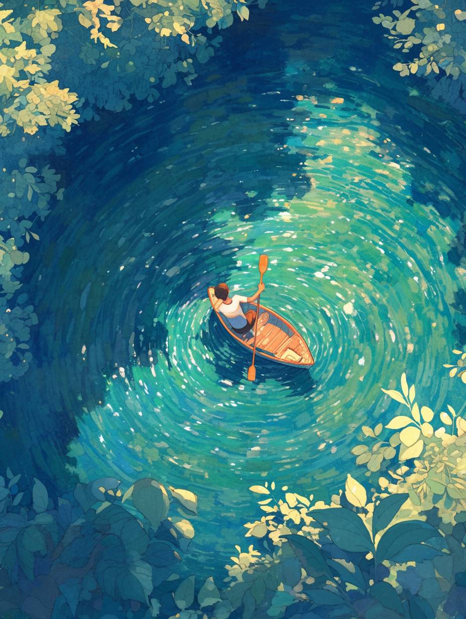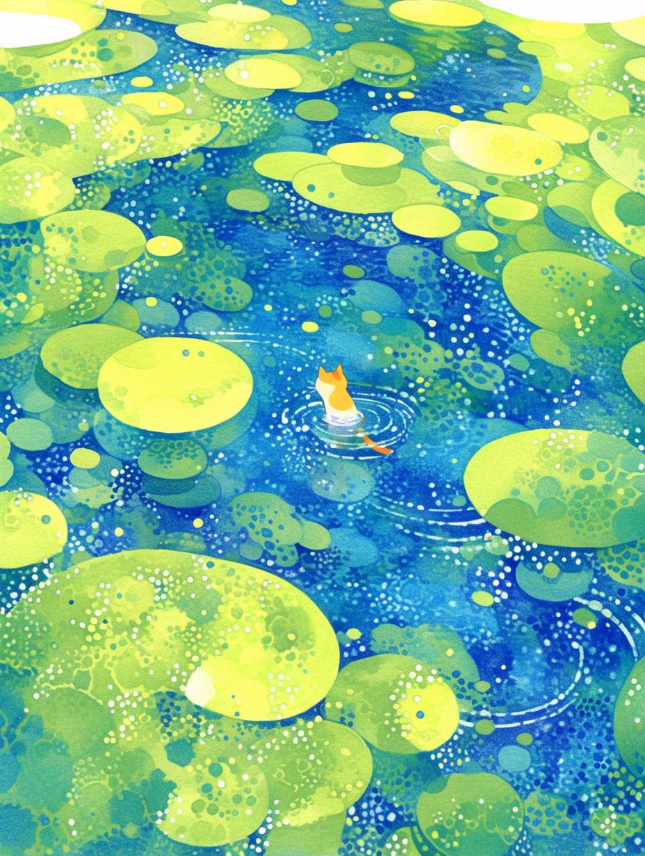 一幅用蠟筆繪製的兒童插圖,描繪了一隻可愛的貓在河裡游泳,周圍是複雜的線條和彩色的漣漪,以綠色為主色調,構圖視角為鳥瞰,從天空俯視。