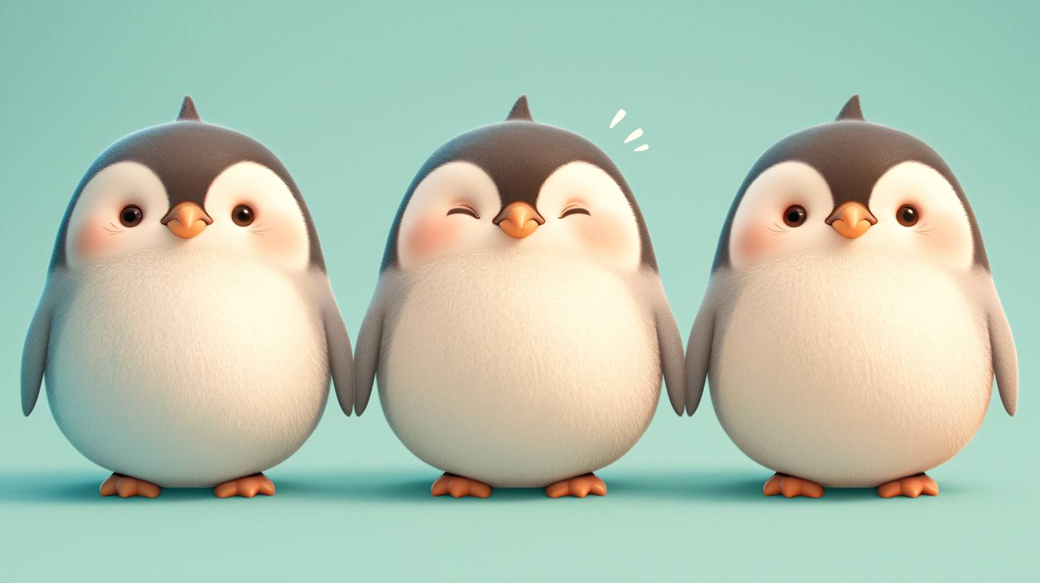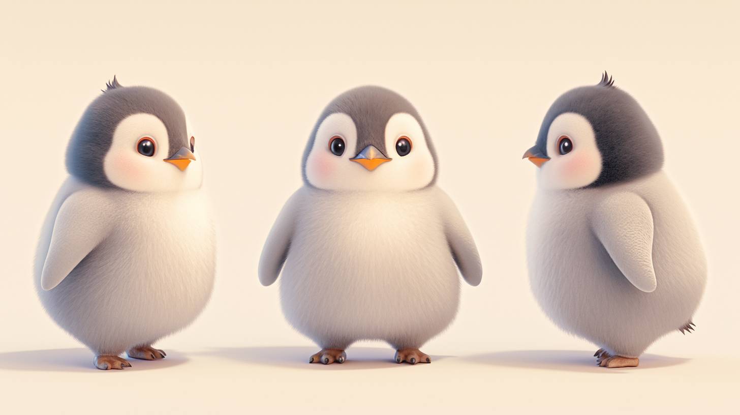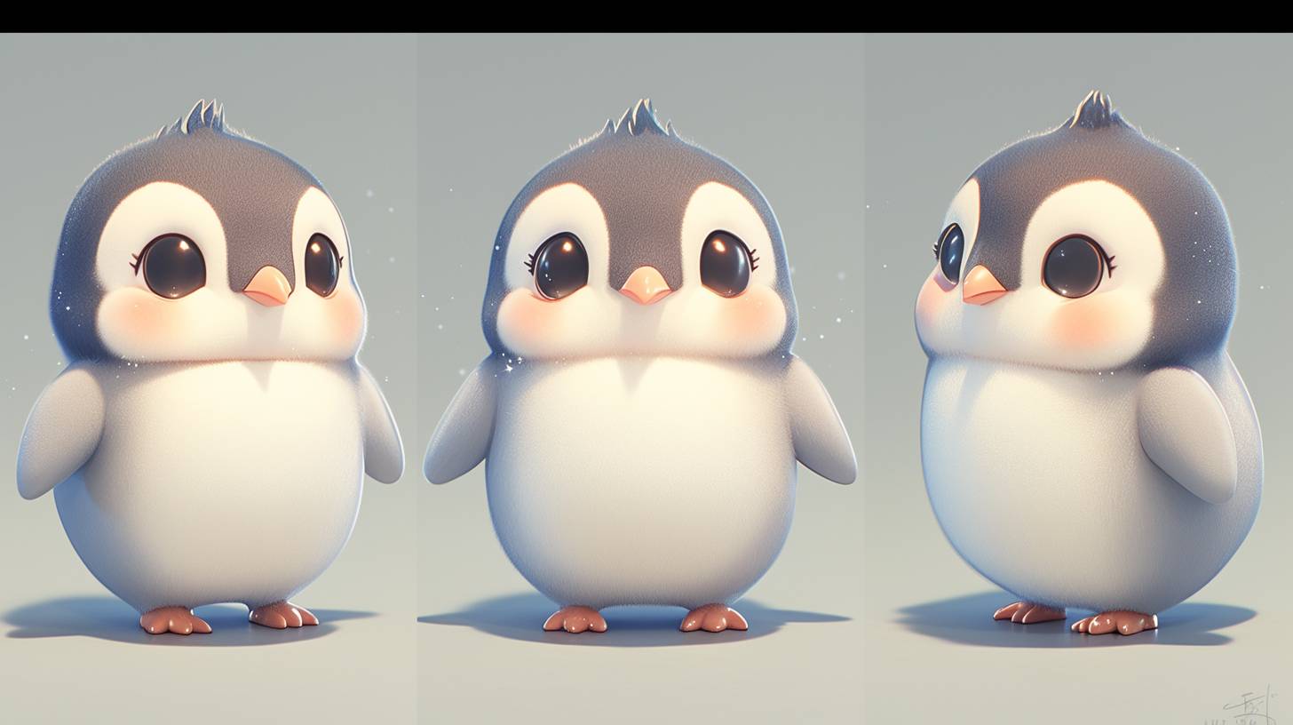 Three Views, Full Body, i.e. Front, Side, and Back View, Q Edition Cute Little Penguin, Anthropomorphic Expressions, 3D, Clay Doll, Wearing Shiny Plastic Costumes, Cute Expressions, Clean Background, Office Lighting, Blind Box Toys, C4D Rendering, 8K, Best Picture Quality --s 450 --ar 16:9 --niji 6