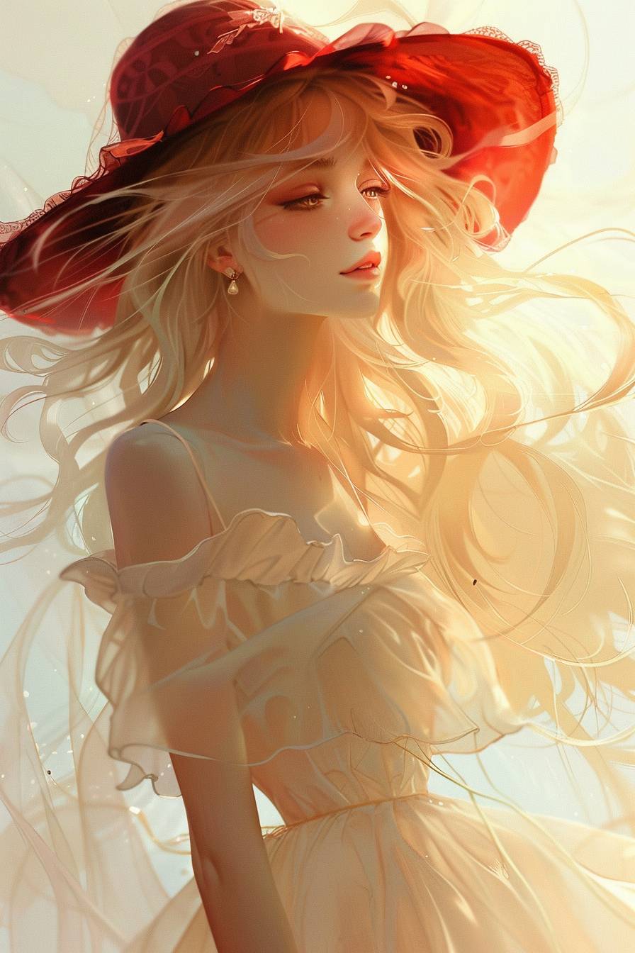 A whimsical girl with blonde hair, wearing a red hat and a cream dress, standing fully Soft and dreamy lighting, hd quality, fantasy-inspired, illustrated style, slight glow effect, enchanting atmosphere, playful pose on a white background --ar 2:3 --v 6.0