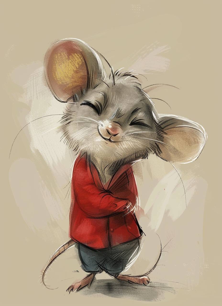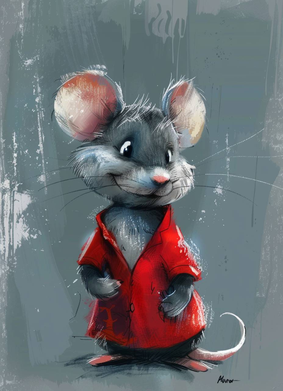 a small gray mouse, with a red shirt, cartoon style draw, for kids, hand-drawn --ar 8:11 --v 6.0