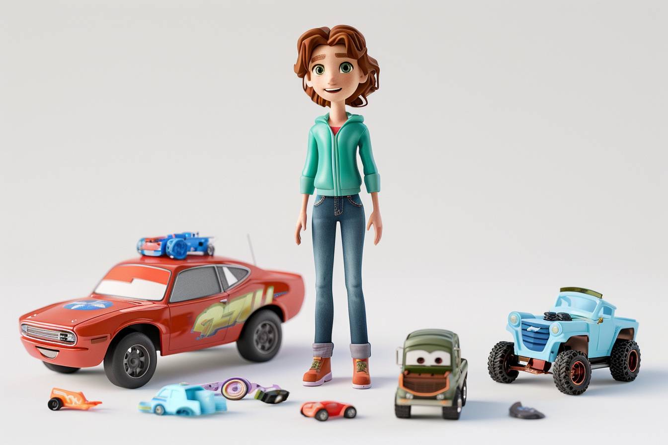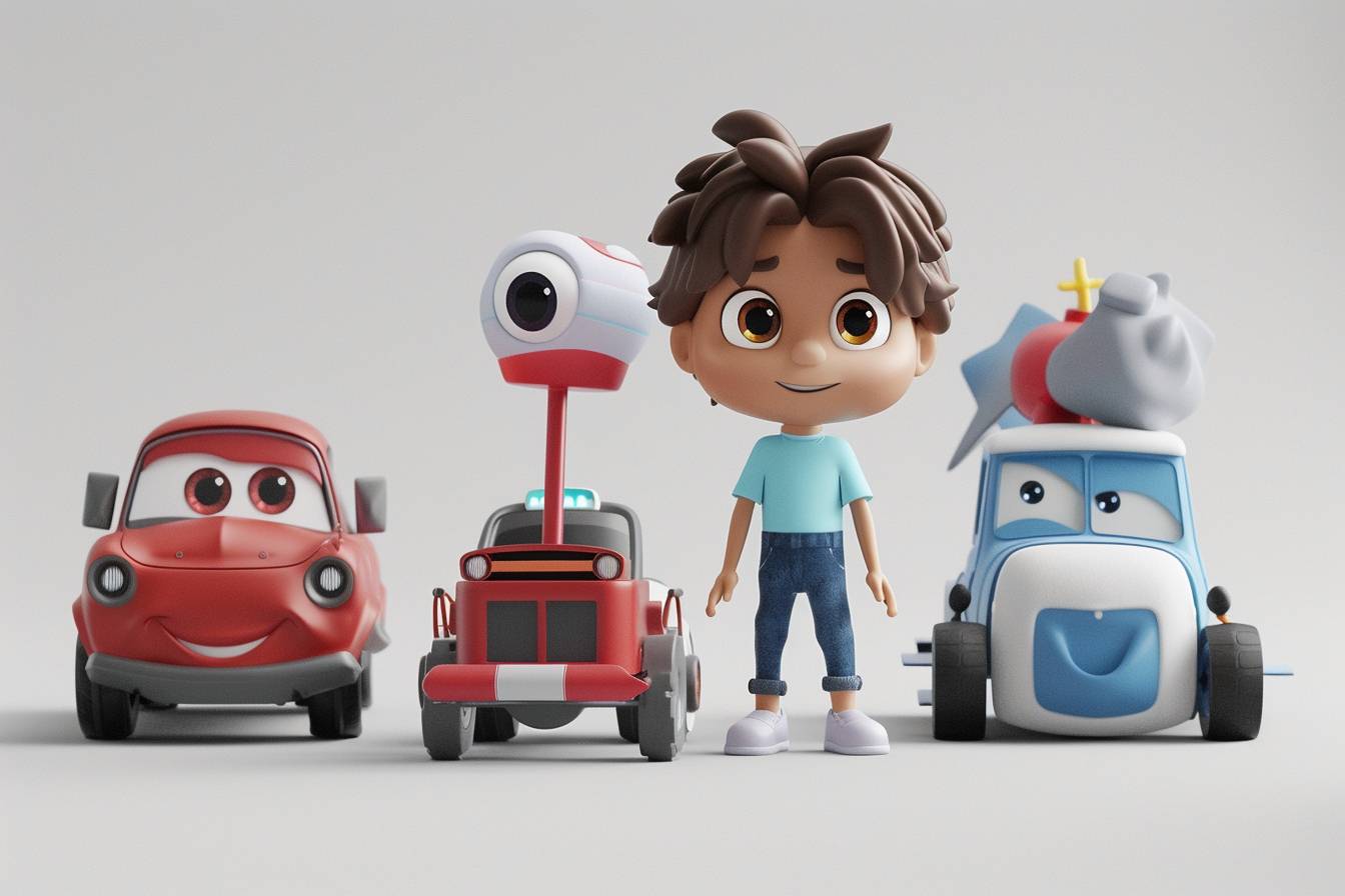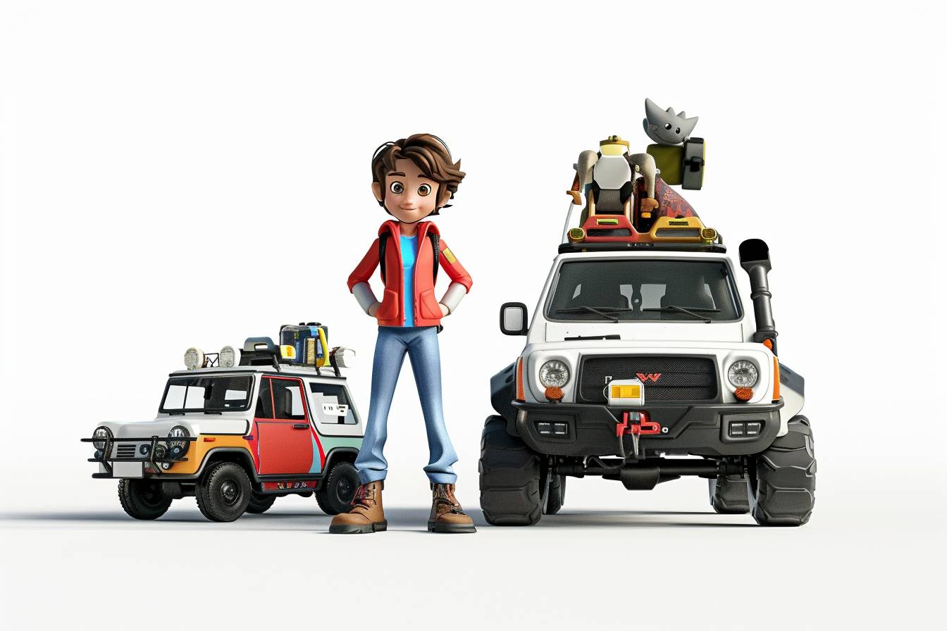 [主題角色性別] 站在 [物件 / 元素 車輛和角色描述] 旁邊。場景的背景包括 [各種主題物件]。風格為皮克斯,採用卡通風格和 3D 渲染,白色背景。