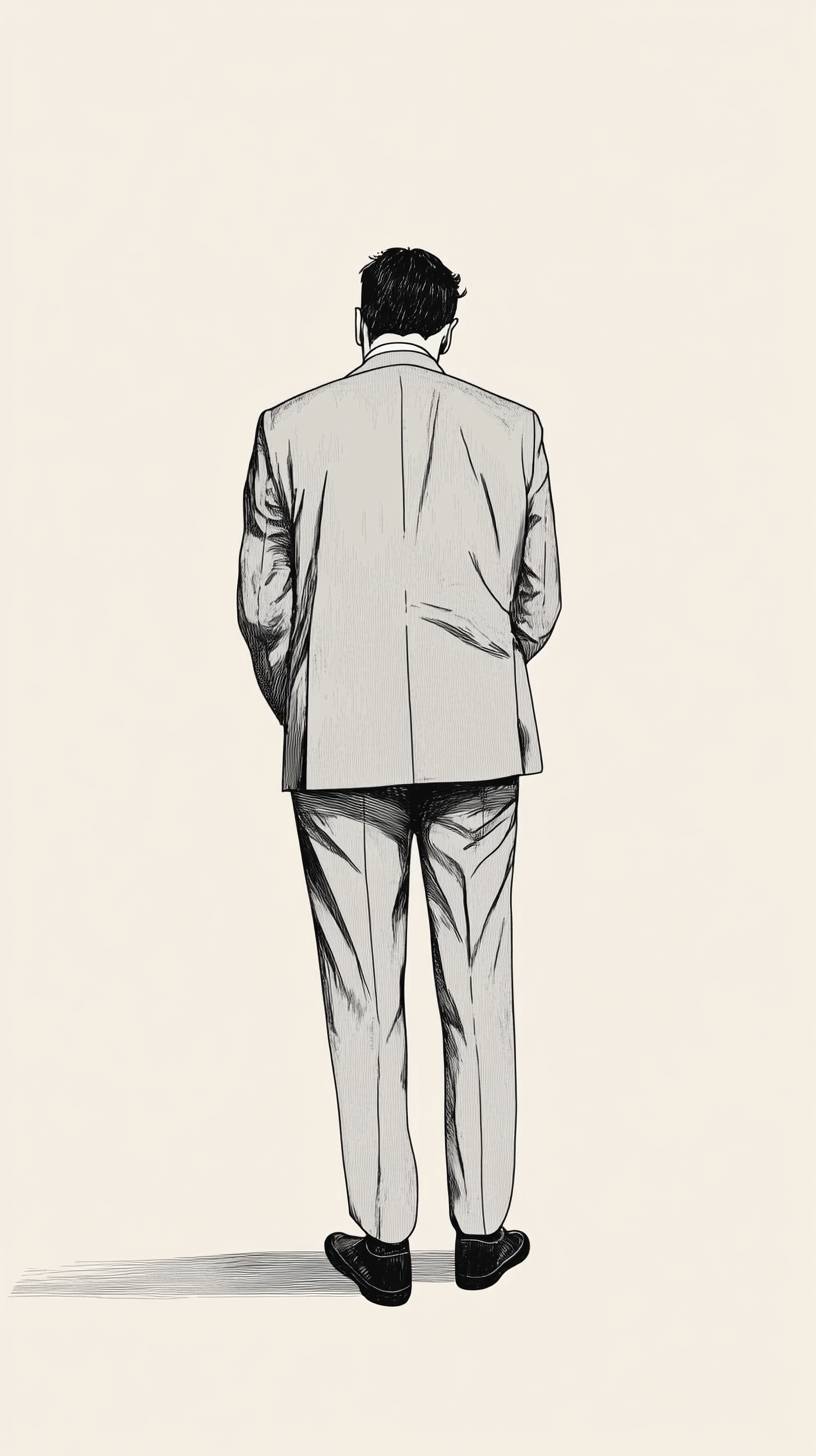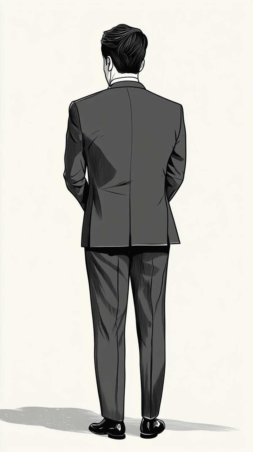a man with his back turned, he is wearing a suit and black shoes, adrian tomine style illustration, black and white, style Very High UHD --ar 9:16 --v 6.1