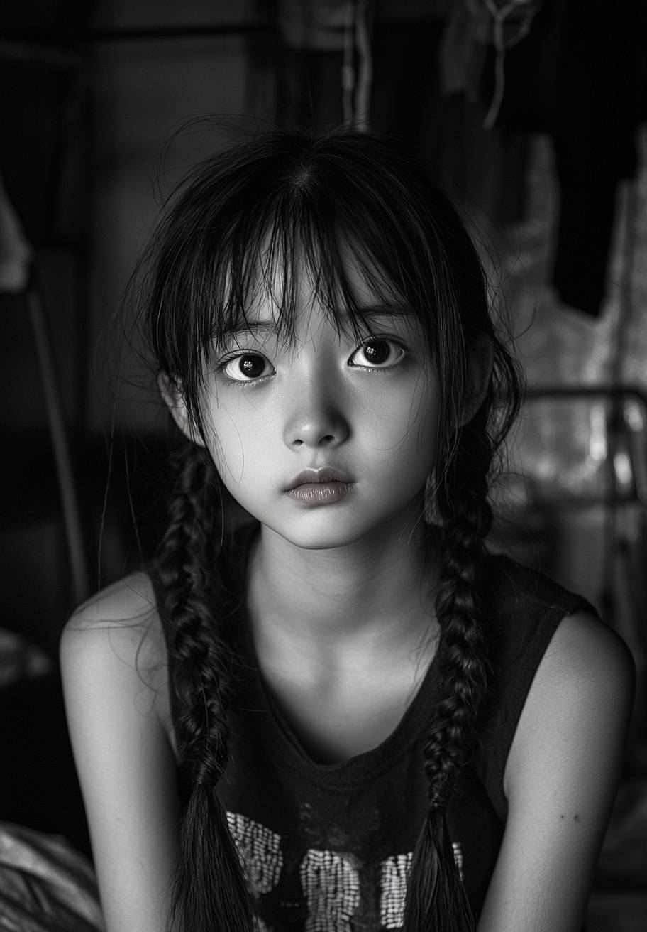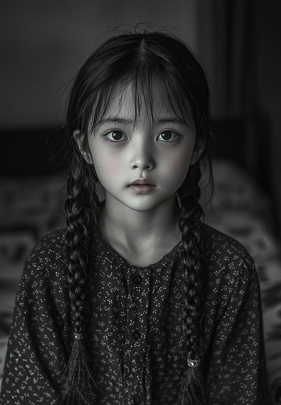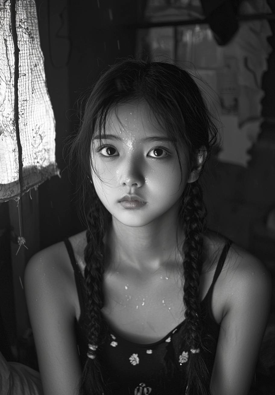 Realistic Photography, On a rainy and cloudy afternoon, an 12 year old Chinese girl sat in front of a bed in a small room, with two braids and a melancholic expression, exuding a strong cinematic vibe, shot by Leica M11 with 50mm lens, --ar 9:13 --quality 2 --stylize 250 --v 6.1