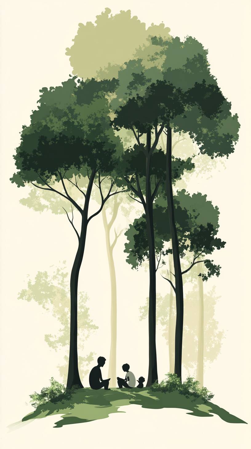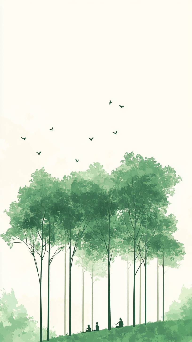 Simple illustration of a green forest with some tall trees and little people sitting under them, simple style, Chinese ink style, lines, light color scheme, flat design style poster art, clean background, bold composition, minimalism, high-end texture , leave it blank, very beautiful and elegant. --ar 9:16 --v 6.1