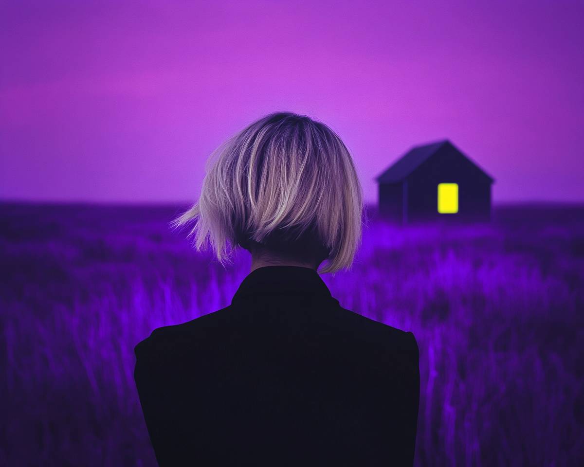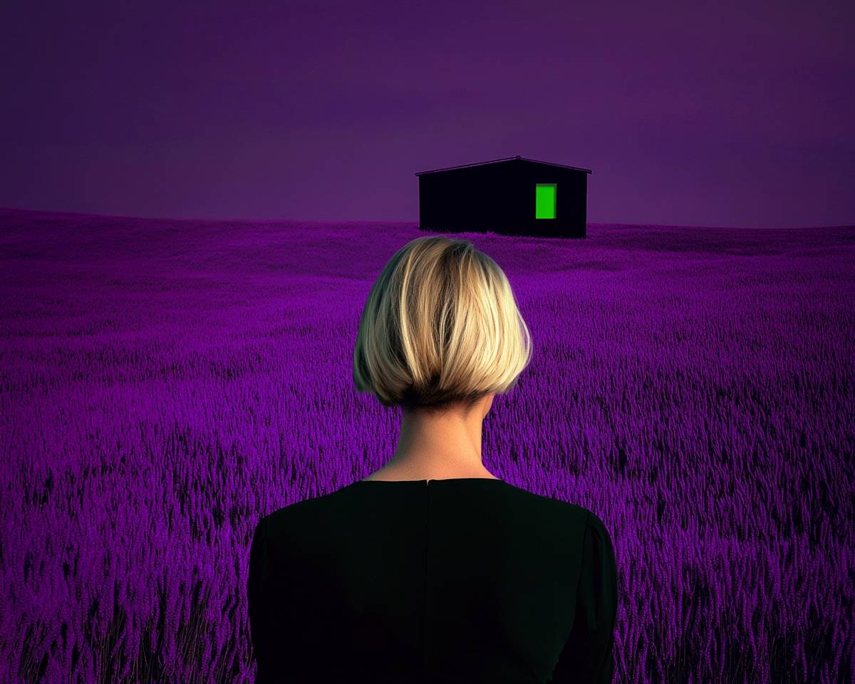conceptual and experimental picture. bright silhouette of blonde woman with short hair from behind, wearing black. plain landscape with dark-purple sky and intense-purple field. minimalist small black house with fluo-green window further away. in the style of fantasy and whimsy --ar 5:4 --v 6.1
