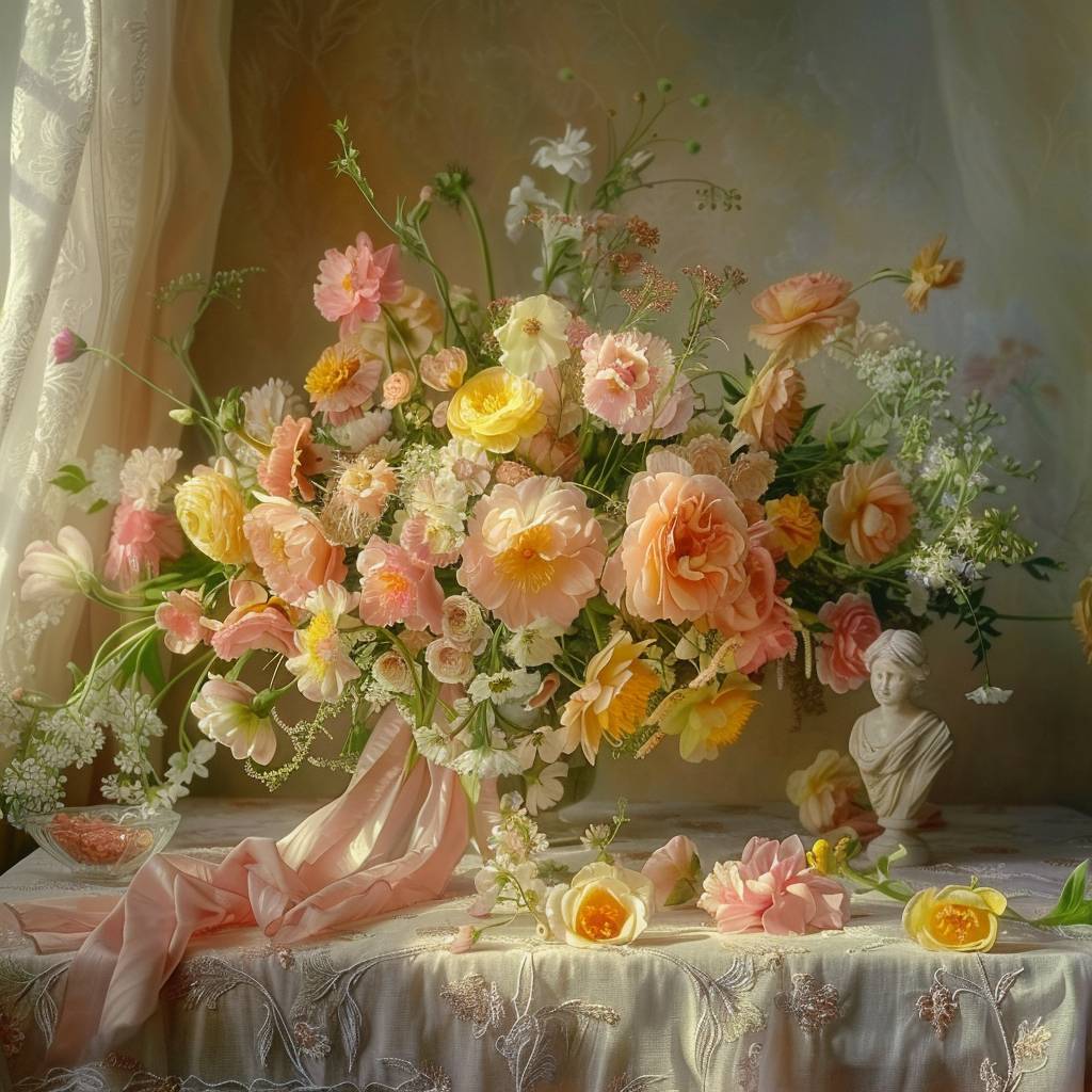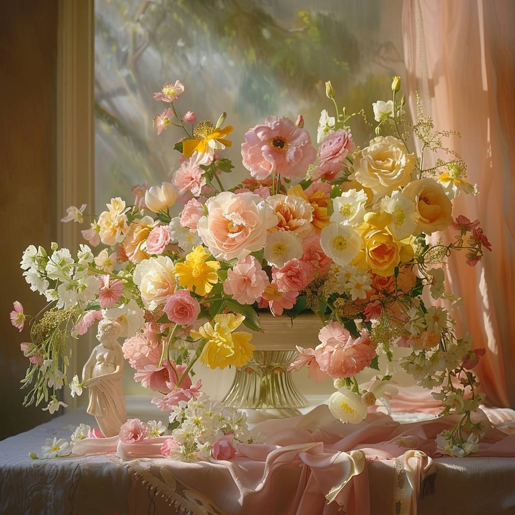 一束令人驚嘆的鮮花放置在優雅的桌子上,沐浴在透過附近窗戶的柔和自然光中。花束由粉色、黃色和白色的多種花卉組成,象徵著女性氣質、歡樂和純潔。精緻的花瓣藝術般地撒落在桌布上,而一條絲帶纏繞在花束中。一尊裝飾性的瓷制女性雕像矗立在鮮花旁,其優雅的身姿體現了力量與美麗。背景中,一個裝滿額外花卉的花瓶散發出溫暖的光芒,進一步增強了慶祝的氛圍。