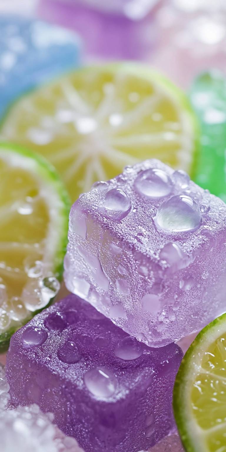 冰塊,淡紫色、淡綠色和淡藍色,帶水珠的青檸片,巧妙排列,柔和的粉彩背景,寧靜的氛圍,高分辨率,高質量,微距鏡頭,自然光,新鮮的色彩,細膩的紋理,寧靜的感覺。