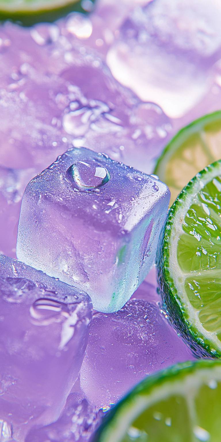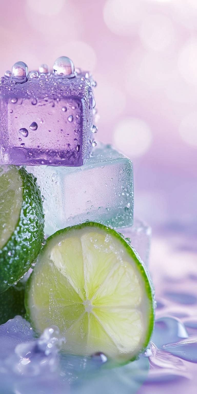 Ice cubes,pale purple, pale green, and pale blue, slices of lime with water droplets, artfully arranged, soft pastel background, serene atmosphere, high resolution, high quality, macro lens, natural light, fresh colors, fine texture, a sense of tranquility. --chaos 2 --ar 1:2 --v 6.1