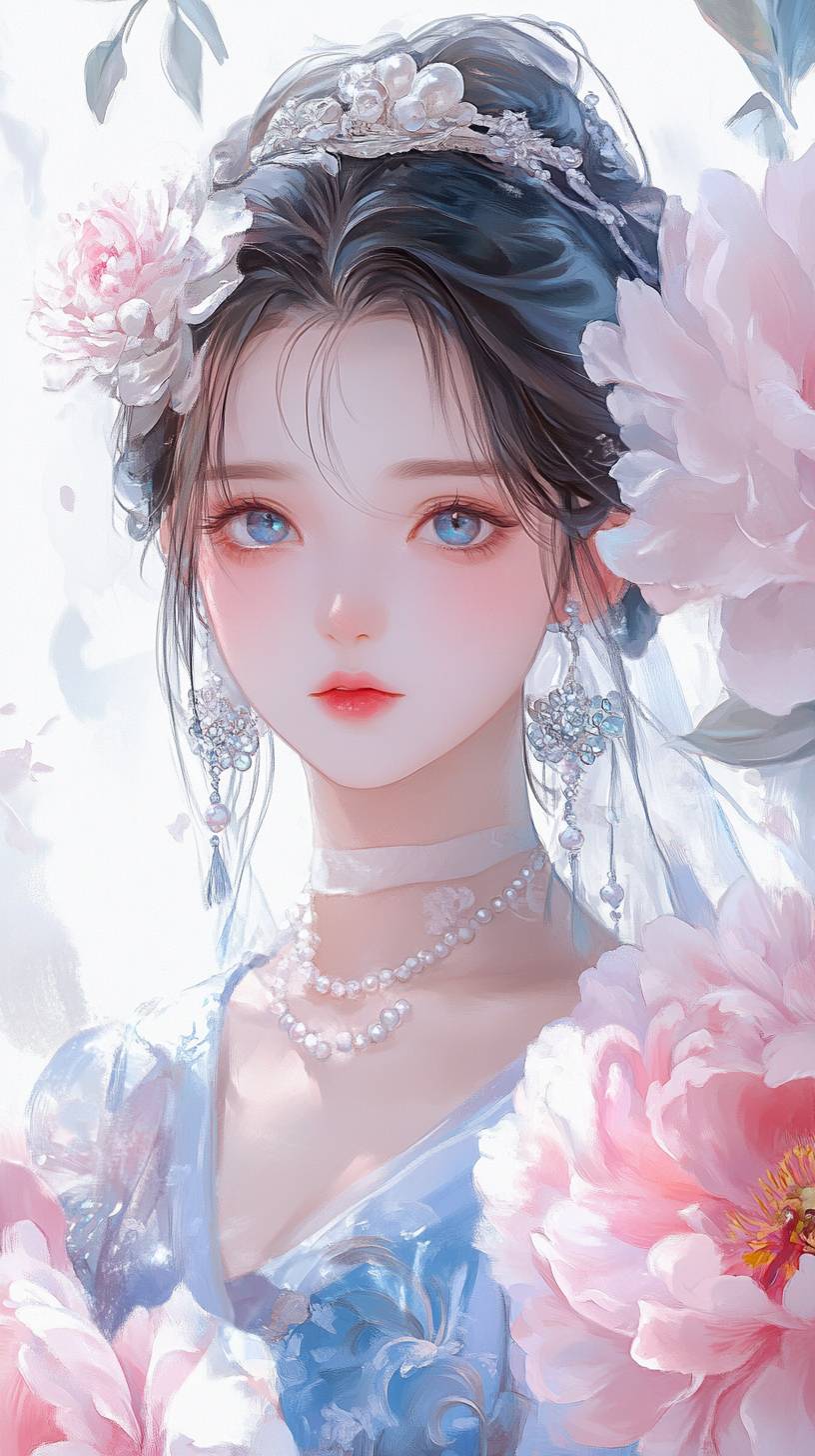 美麗的動漫女孩穿著一件粉藍色的牡丹裙,耳朵上掛著大珍珠耳環。輕水彩風格的背景為白色,細膩的筆觸和明亮的色彩形成對比。這是一幅漫畫插畫角色設計的上半身特寫,主題是粉紅色的腮紅和藍色的眼睛。她的姿態優雅,背景則裝飾著大花朵。風格為數字油畫。