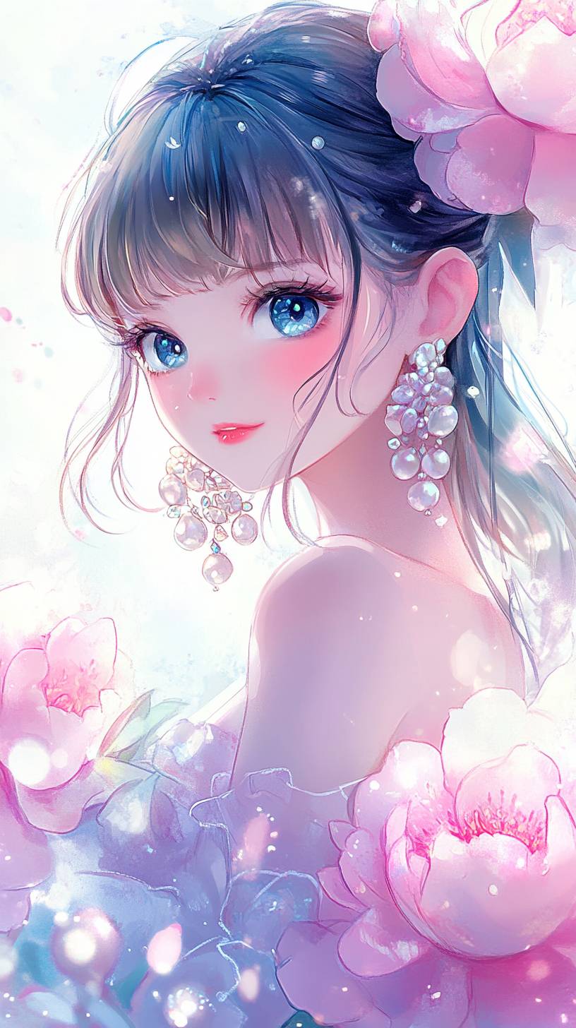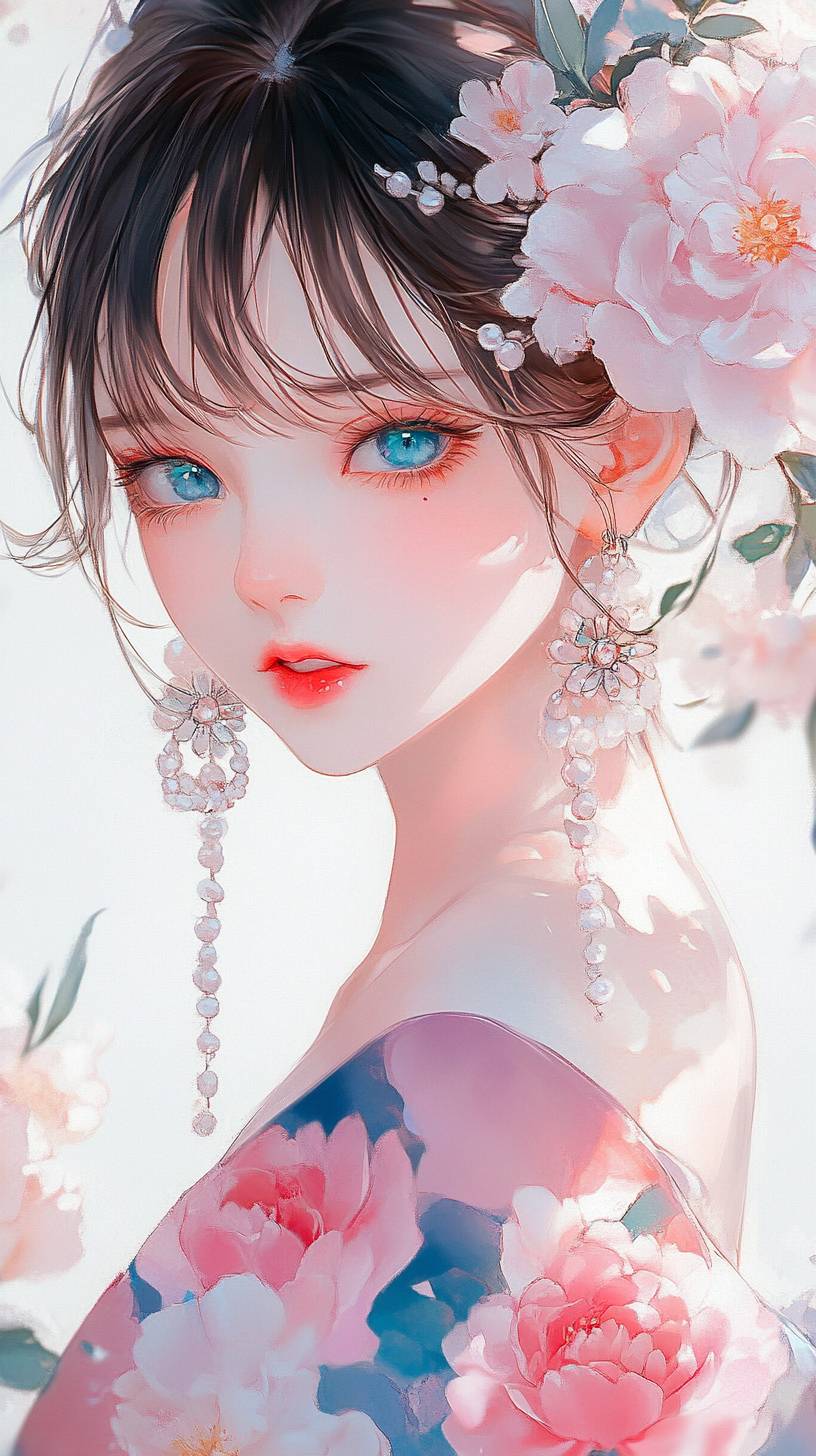 Beautiful anime girl wearing a pink and blue peony dress with big earrings containing pearls. The light watercolor style features a white background with delicate brushstrokes and bright colors. It is an upper body close-up of a manga illustration character design with a pink blush theme and blue eyes. She has an elegant posture against a background decorated with large flowers. The style is in the style of .Digital oil painting --ar 9:16 --v 6.1